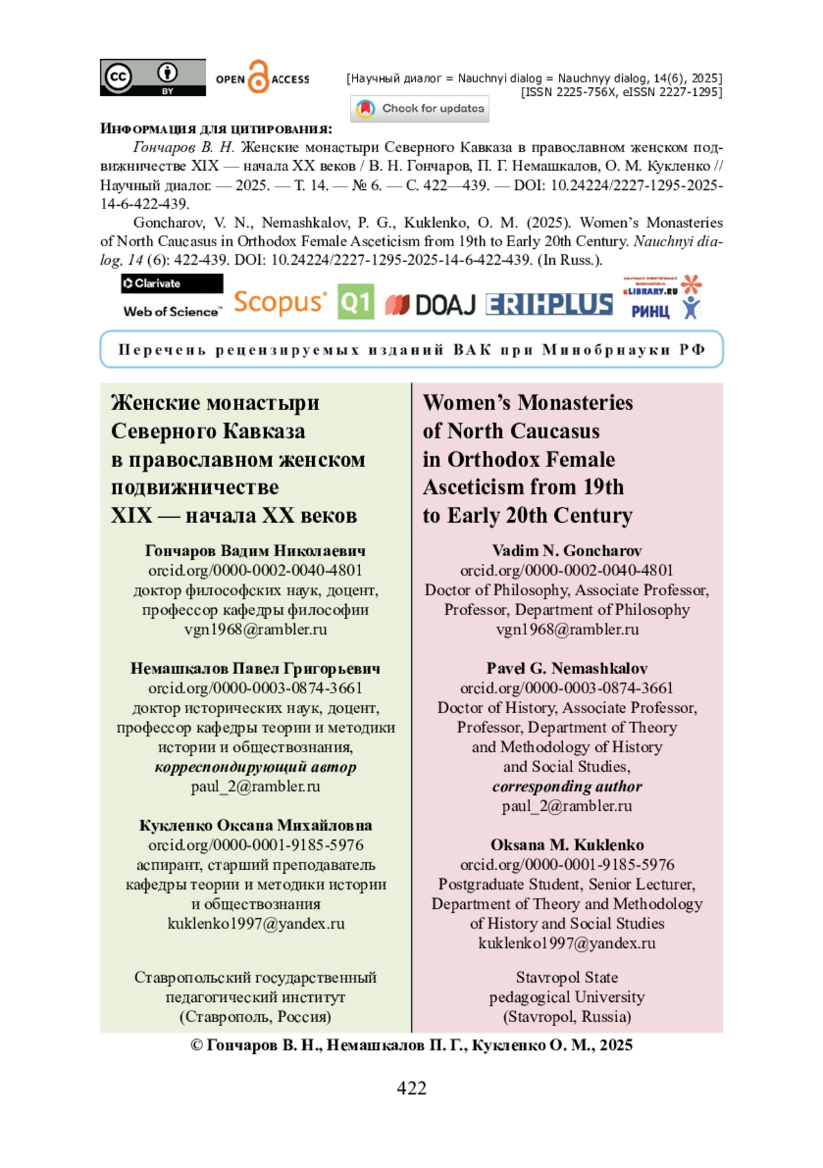 11. Марие-Магдалинская женская пустынь на Кубани в деле призрения, образования и просвещения во второй половине XIX- начале XXв./ Е.Ю.Любушкина, И.Н.Моргун, П. Г. Немашкалов, О. Н. Новикова, О. И. Шафранова // Вопросы истории. - 2022. - № 4-2. - С. 32-40. - https://doi.org/10.31166/VoprosyIstorii202204Statyi46.