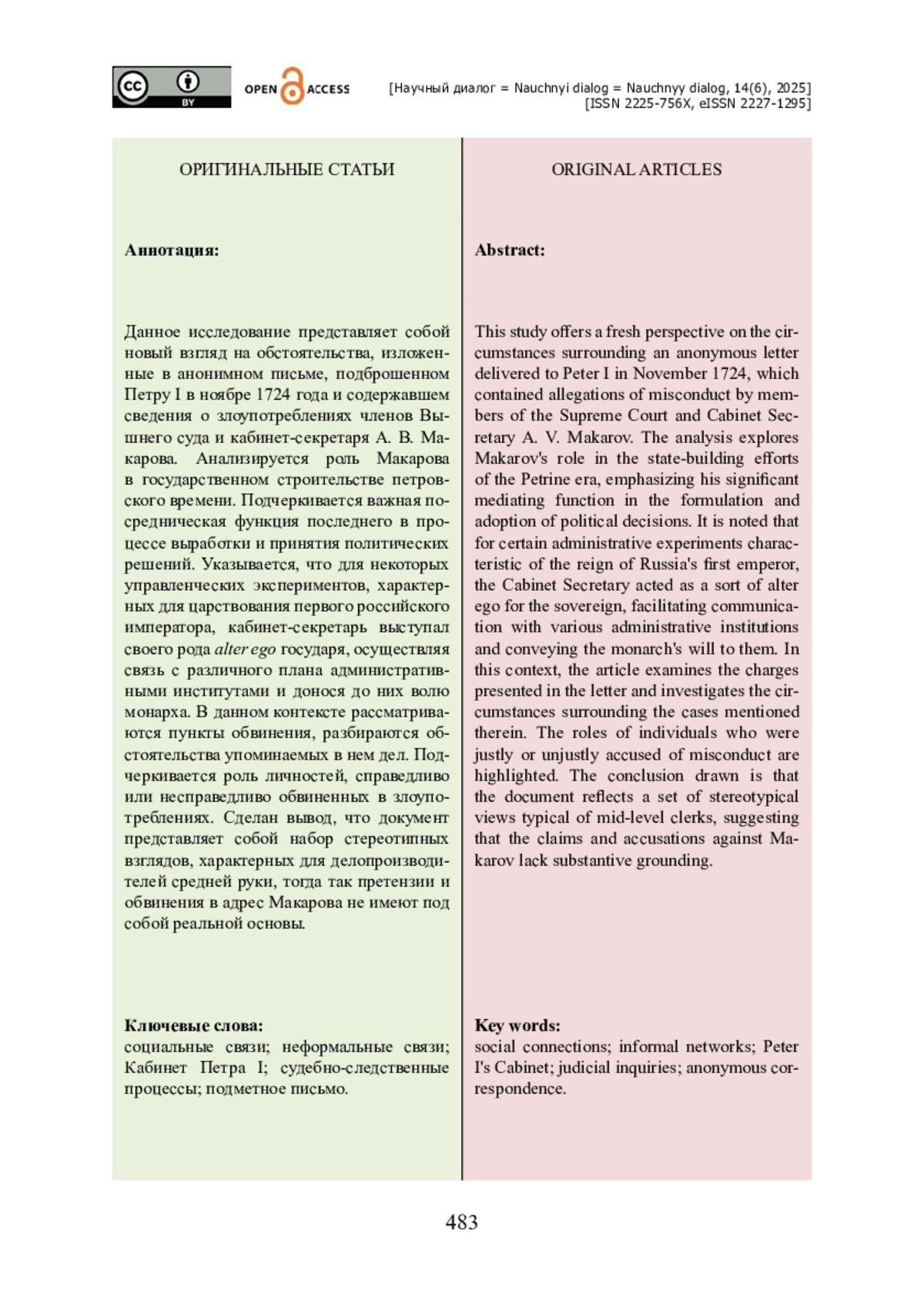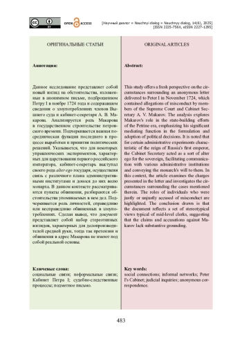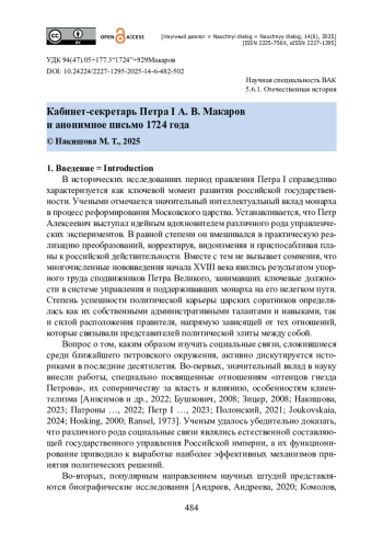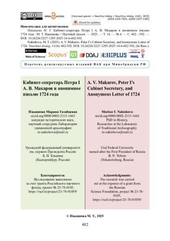 Данное исследование представляет собой новый взгляд на обстоятельства, изложенные в анонимном письме, подброшенном Петру I в ноябре 1724 года и содержавшем сведения о злоупотреблениях членов Вышнего суда и кабинет-секретаря А. В. Макарова. Анализируется роль Макарова в государственном строительстве петровского времени. Подчеркивается важная посредническая функция последнего в процессе выработки и принятия политических решений. Указывается, что для некоторых управленческих экспериментов, характерных для царствования первого российского императора, кабинет-секретарь выступал своего рода alter ego государя, осуществляя связь с различного плана административными институтами и донося до них волю монарха. В данном контексте рассматриваются пункты обвинения, разбираются обстоятельства упоминаемых в нем дел. Подчеркивается роль личностей, справедливо или несправедливо обвиненных в злоупотреблениях. Сделан вывод, что документ представляет собой набор стереотипных взглядов, характерных для делопроизводителей средней руки, тогда так претензии и обвинения в адрес Макарова не имеют под собой реальной основы.