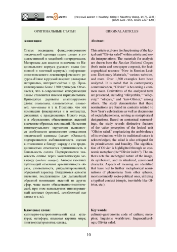 Статья посвящена функционированию лексической единицы салат оливье в художественной и медийной интерпретации. Материалы для анализа извлечены из Национального корпуса русского языка (основной и газетный корпусы), информационно-поискового лексикографического ресурса «Новое в русской лексике: словарные материалы», интернет-сайтов и др. Проанализировано более 1300 примеров. Отмечается, что в современной коммуникации оливье становится именем нарицательным. Приводятся дериваты анализируемого слова: оливьешка, оливьеведение, оливьевед, raw-оливье и т. п. Показано, что эти номинации фиксируются и в контекстах, связанных с празднованием Нового года, и в обсуждениях общественных явлений в качестве образных номинаций. На основе контекстуального окружения выявляются особенности ценностного осмысления лексической единицы (салат «Оливье»); подчеркивается амбивалентность оценки в отношении к блюду: наряду с его традиционностью отмечается примитивность и банальность салата. Подчеркивается знаковость оливье через экономическую метафору (индекс оливье). Авторы газетных публикаций отмечают архетипичность образа, символьность, ритуализированный, обрядовый характер. Выделяются аспекты значения, послужившие для дальнейшей образной номинации явлений из других сфер, чаще всего общественно-политической, при этом используется типизированный контекст (простой, неизбежный как оливье и т. п.).