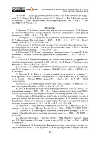 4. Капелюшник Е. В. Человек сквозь призму кулинарного кода культуры / Е. В. Капелюшник // Вестник Томского государственного университета. - 2011. - № 345. - С. 11-14.