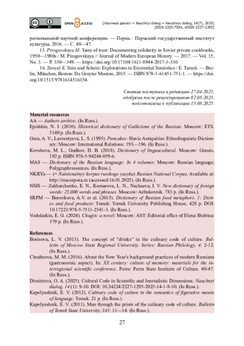 1. Борисова Л. В. Концепт «напитки» в кулинарном коде культуры / Л. В. Борисова // Вестник Московского государственного областного университета. Серия: Русская филология. - 2013. - № 4. - С. 2-12.
