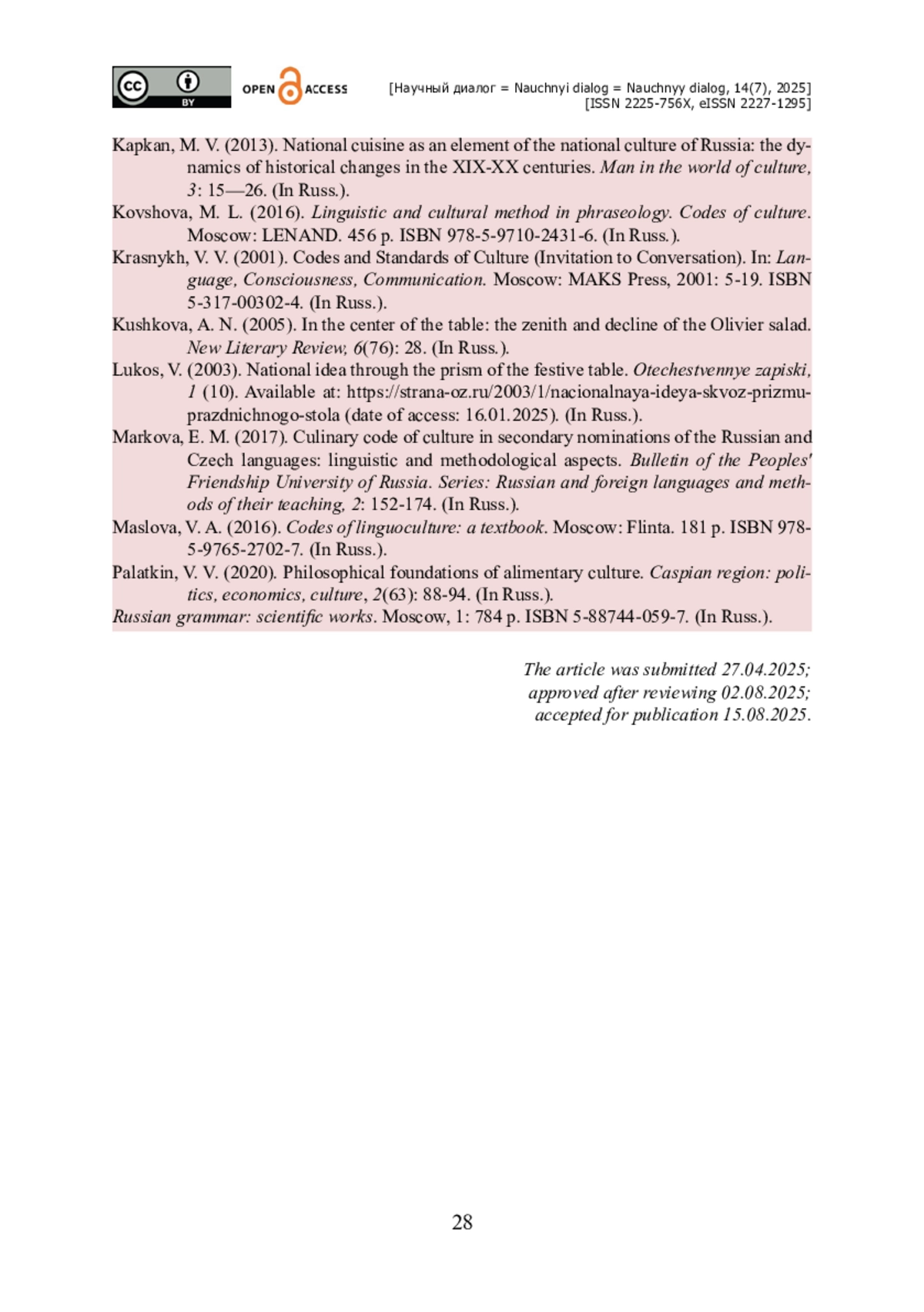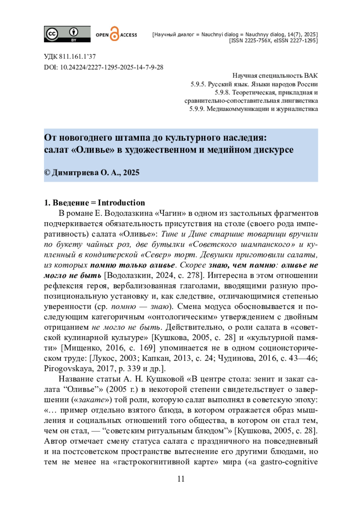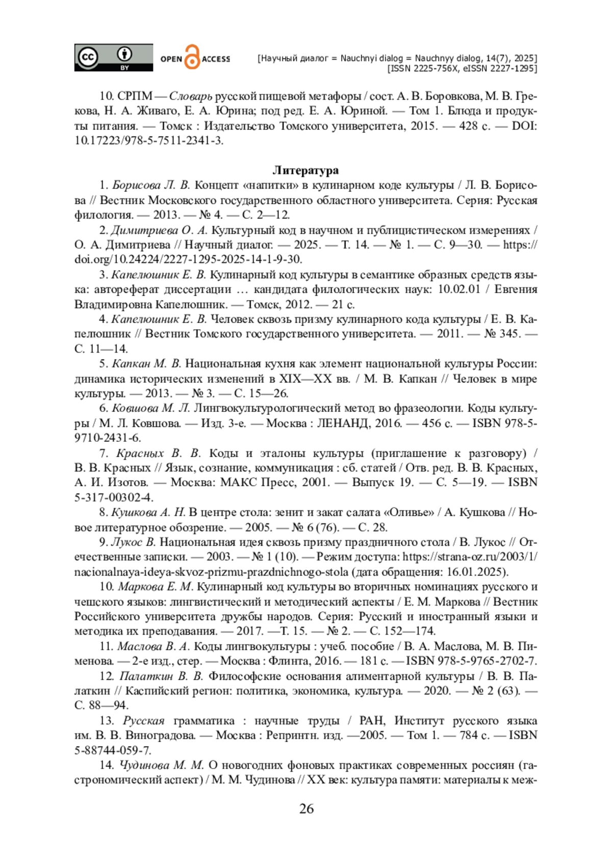 2. Димитриева О. А. Культурный код в научном и публицистическом измерениях / О. А. Димитриева // Научный диалог. - 2025. - Т. 14. - № 1. - С. 9-30. - https://doi.org/10.24224/2227-1295-2025-14-1-9-30.