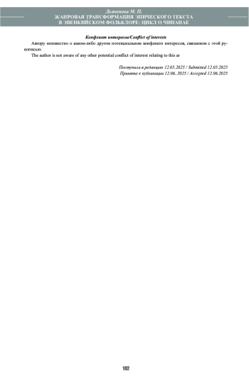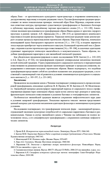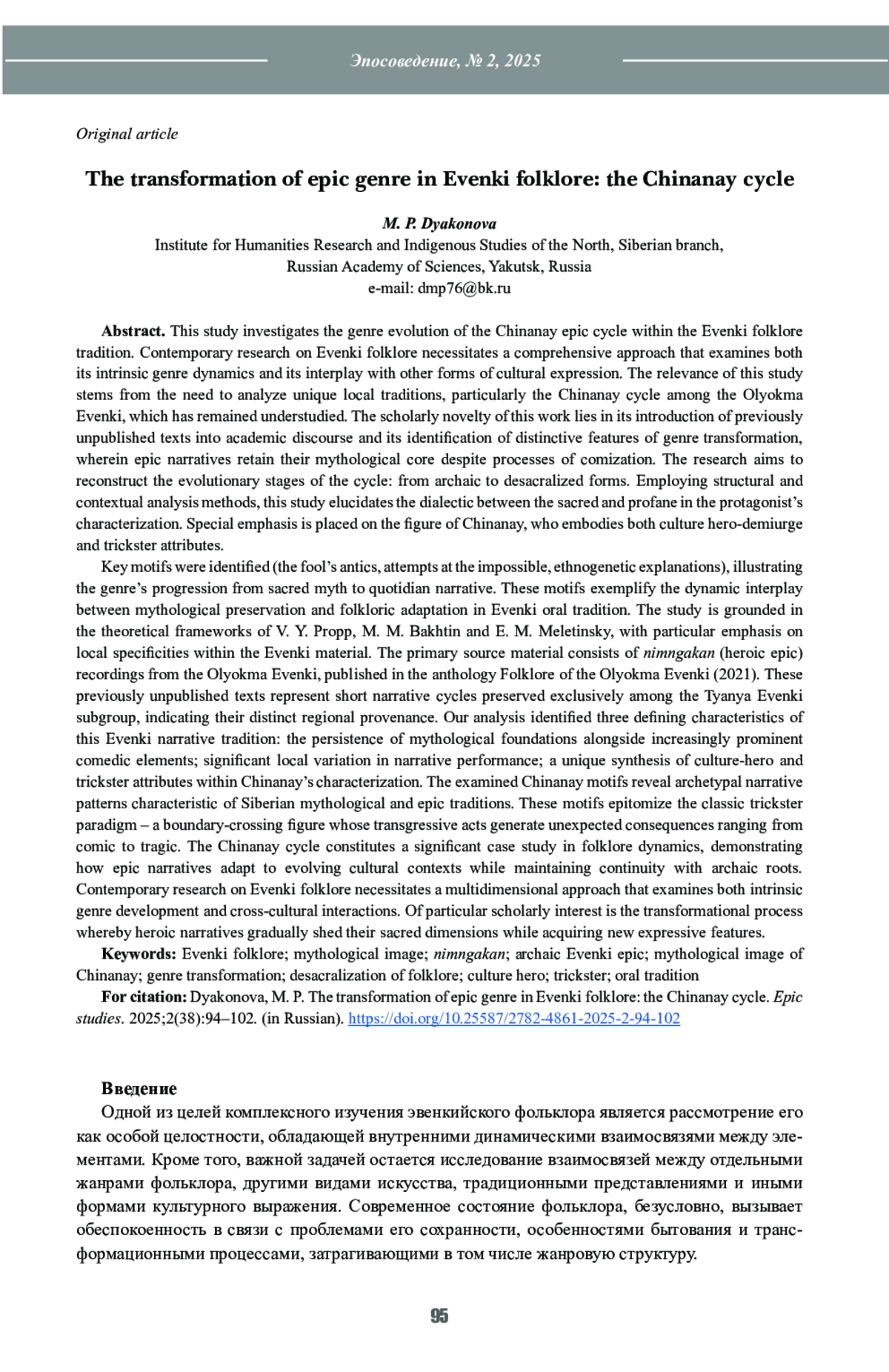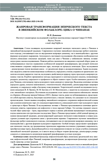 Статья посвящена исследованию жанровой эволюции эпического цикла о Чинанае в эвенкийской фольклорной традиции. Современное изучение эвенкийского фольклора требует комплексного подхода, учитывающего как его внутреннюю жанровую динамику, так и взаимодействие с другими формами культурного выражения. Актуальность настоящего исследования обусловлена необходимостью анализа уникальных локальных традиций, таких как цикл о Чинанае у олёкминских эвенков, остававшихся ранее малоисследованными. Новизна работы заключается во введении в научный оборот ранее не публиковавшихся текстов и выявлении особенностей жанровой трансформации, при которой эпическое повествование сохраняет мифологическое ядро, несмотря на процессы комизации. Цель исследования – реконструкция этапов эволюции цикла – от архаических форм к десакрализованным. Задачи исследования: выделить сюжетно-композиционные особенности, определить степень сохранности архаических элементов в поздних вариантах текстов, исследовать двойственную природу героя, проследить жанровую динамику текстов. В работе применяются методы структурного и контекстуального анализа, позволяющие раскрыть диалектику сакрального и профанного в образе главного героя. Особое внимание уделяется образу Чинаная, сочетающему черты культурного героя-демиурга и трикстера. Выделены ключевые мотивы (проделок дурака, попыток невозможного, этногенетических объяснений), демонстрирующие жанровую динамику от сакрального мифа к бытовому повествованию. Теоретической основой исследования послужили концепции В. Я. Проппа, М. М. Бахтина и Е. М. Мелетинского, с акцентом на локальных особенностях эвенкийского материала. Источником исследования стали записи нимнгаканов олёкминских эвенков из сборника «Фольклор эвенков Олёкмы» (2021). Данные тексты, ранее не публиковавшиеся, представляют собой короткие сюжеты, бытующие исключительно у тянских эвенков, что указывает на их локальное происхождение. Анализ выявил специфику эвенкийского материала: сохранение мифологической основы при усилении комических черт; его локальную вариативность; уникальный синтез черт культурного героя и трикстера в образе Чинаная. В исследованных мотивах о Чинанае прослеживаются ключевые архетипические сюжеты, характерные для мифологии и эпоса народов Сибири. Эти мотивы отражают классический образ трикстера – героя, нарушающего нормы и своими действиями вызывающего неожиданные, подчас комические или трагические последствия. Цикл о Чинанае представляет собой ценный пример динамики фольклорной традиции, демонстрирующий адаптацию эпического повествования к новым культурным условиям при сохранении связи с архаическими корнями. Современное изучение эвенкийского фольклора требует комплексного подхода, учитывающего как его внутреннюю жанровую динамику, так и взаимодействие с другими формами культурного выражения. Особый интерес представляет трансформация эпических текстов, где традиционные героические нарративы постепенно утрачивают сакральность, приобретая новые черты. Дальнейшая работа в этом направлении позволит не только углубить понимание эвенкийской эпической традиции, но и внести вклад в общую теорию фольклора, демонстрируя универсальность и уникальность механизмов жанровой трансформации в устны