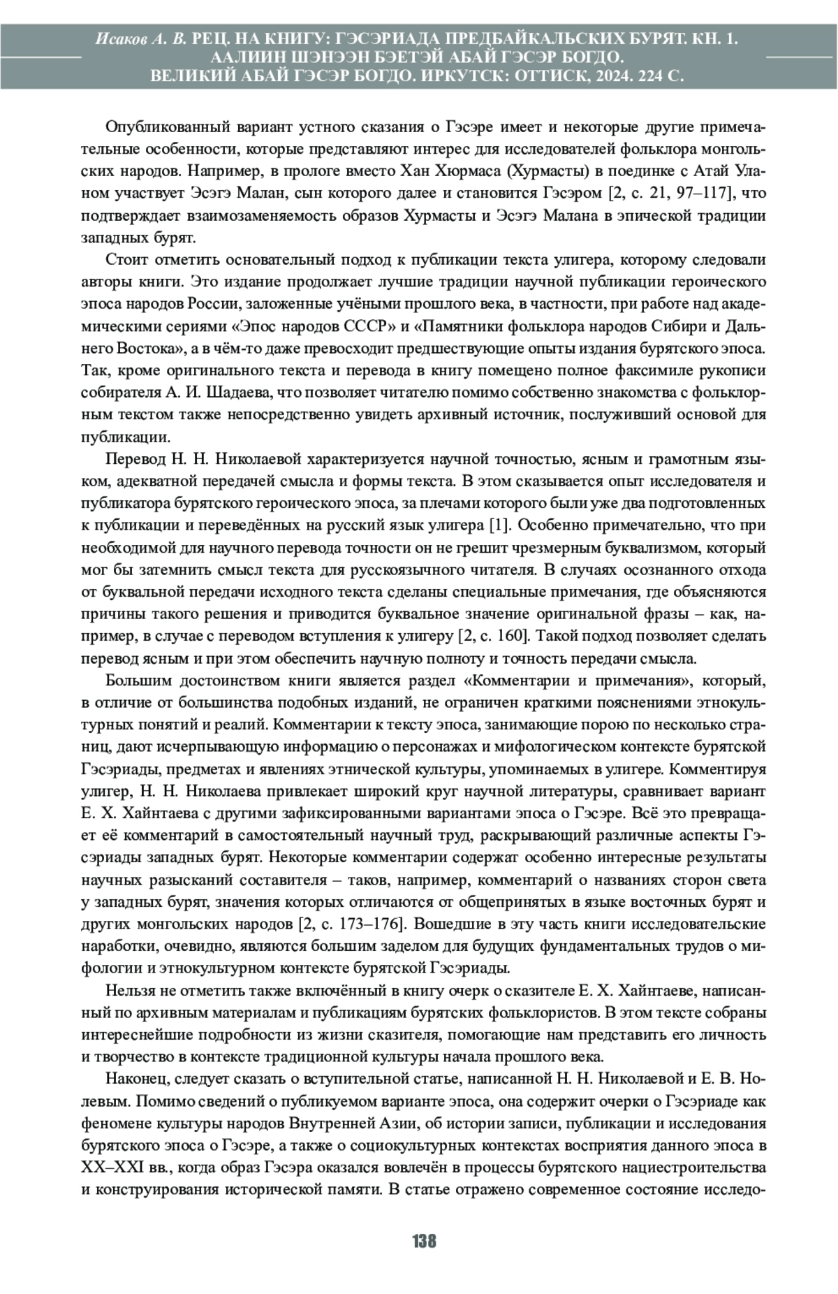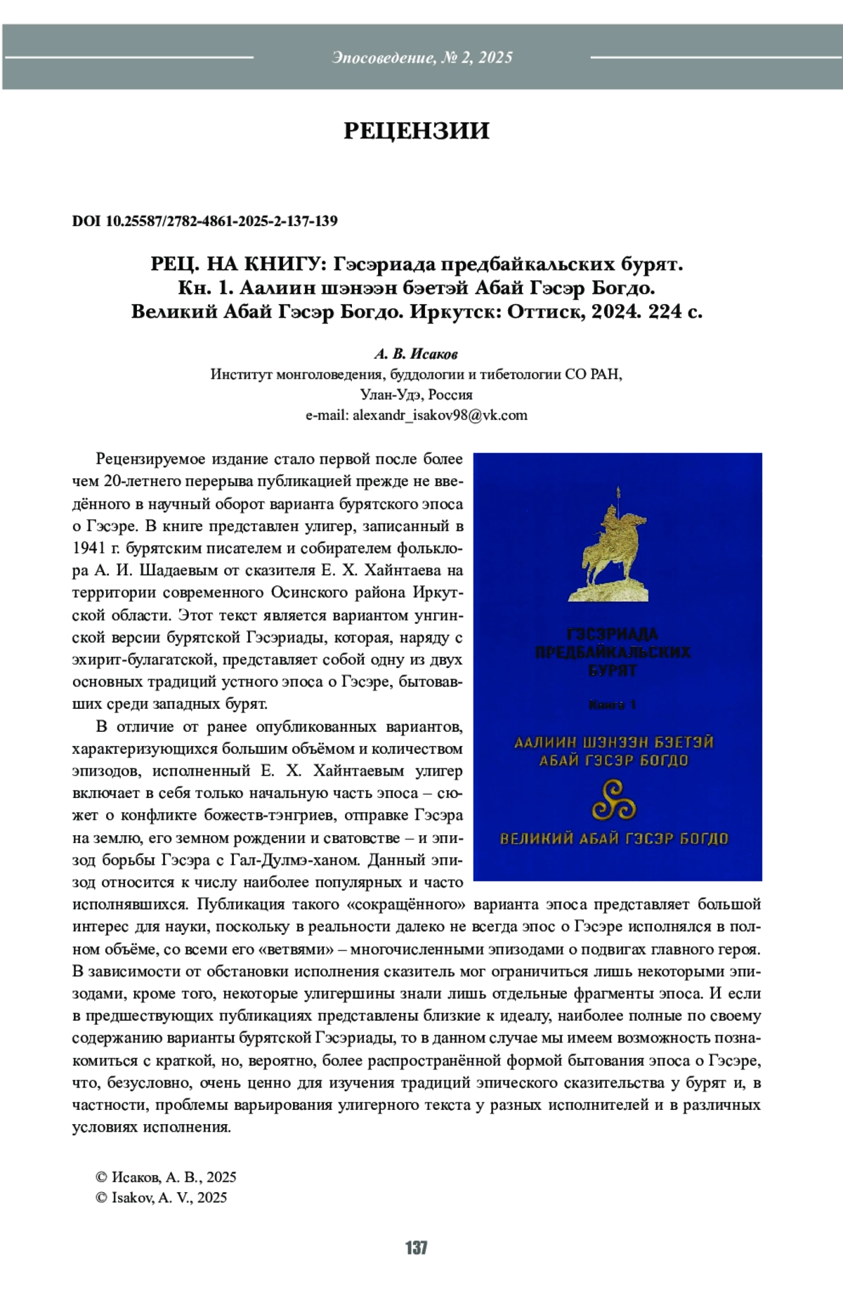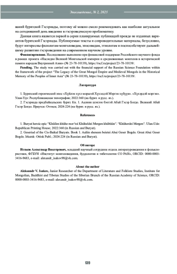 2. Гэсэриада предбайкальских бурят. Кн. 1. Аалиин шэнээн бэетэй Абай Гэсэр Богдо. Великий Абай Гэсэр Богдо. Иркутск: Оттиск; 2024:224 (на бурят. и русс. яз.).