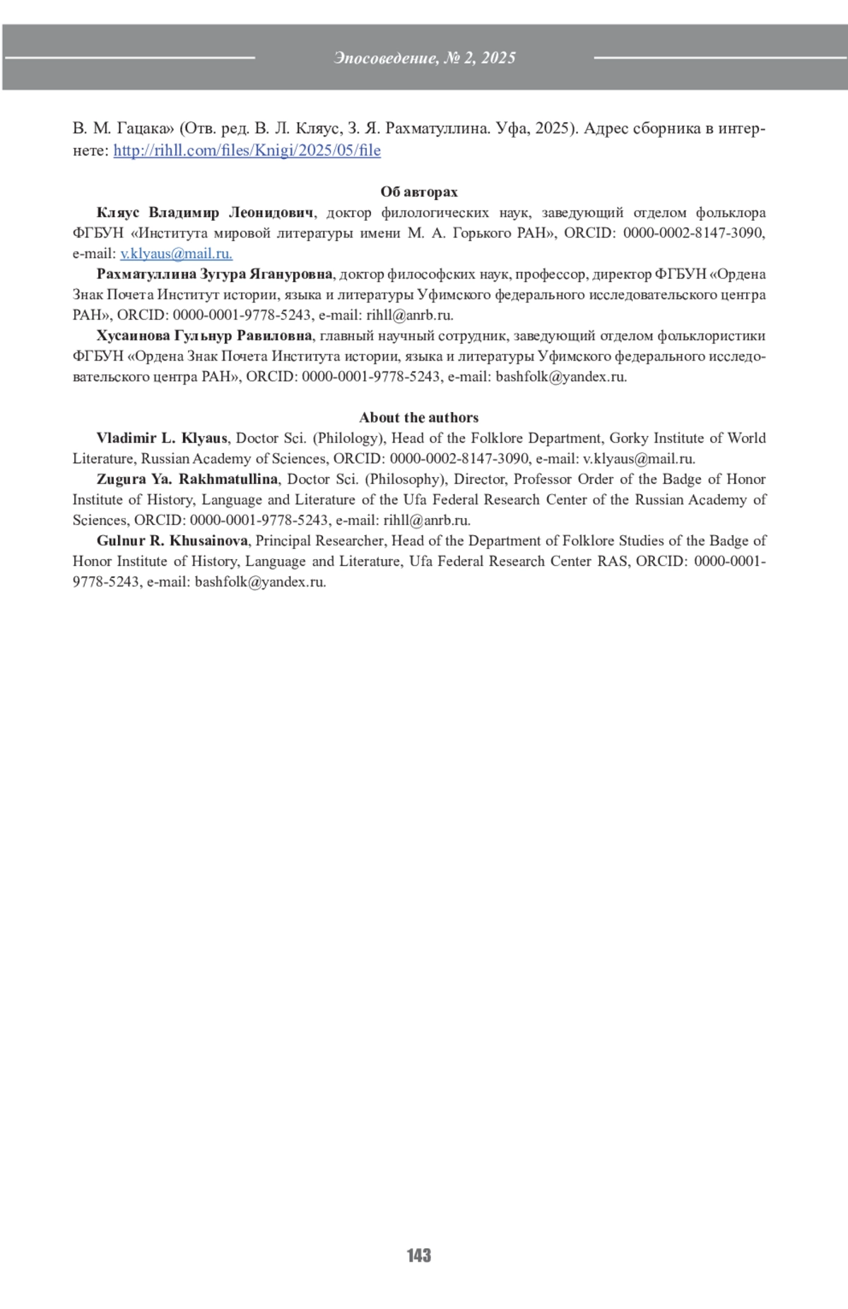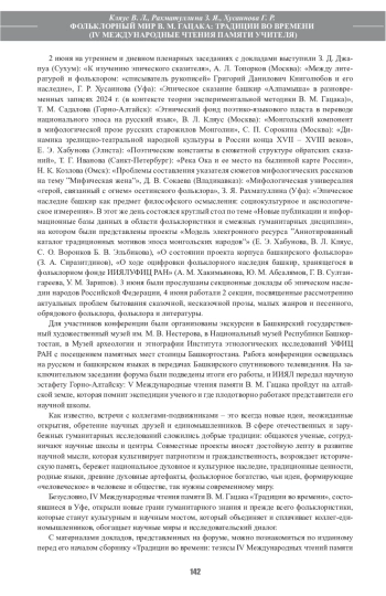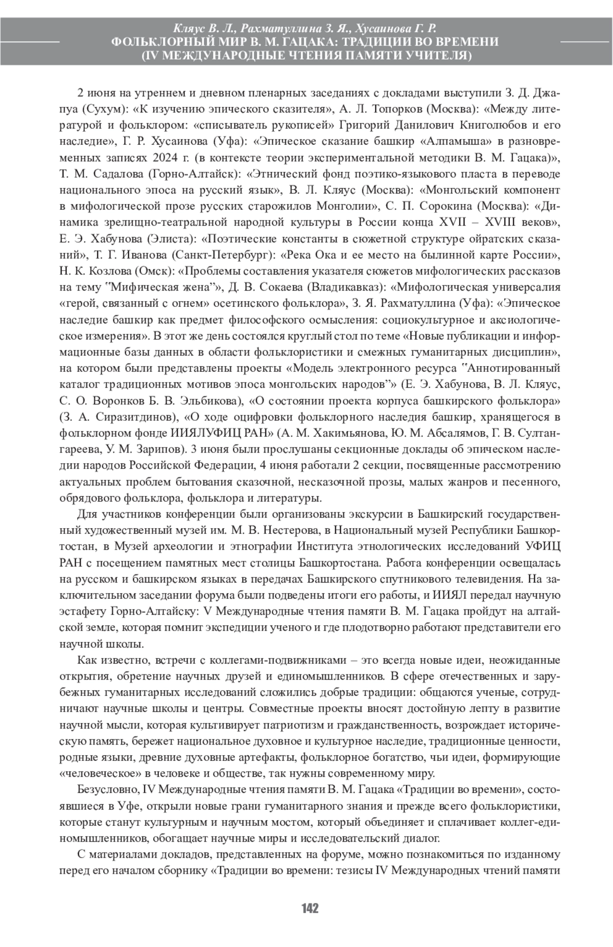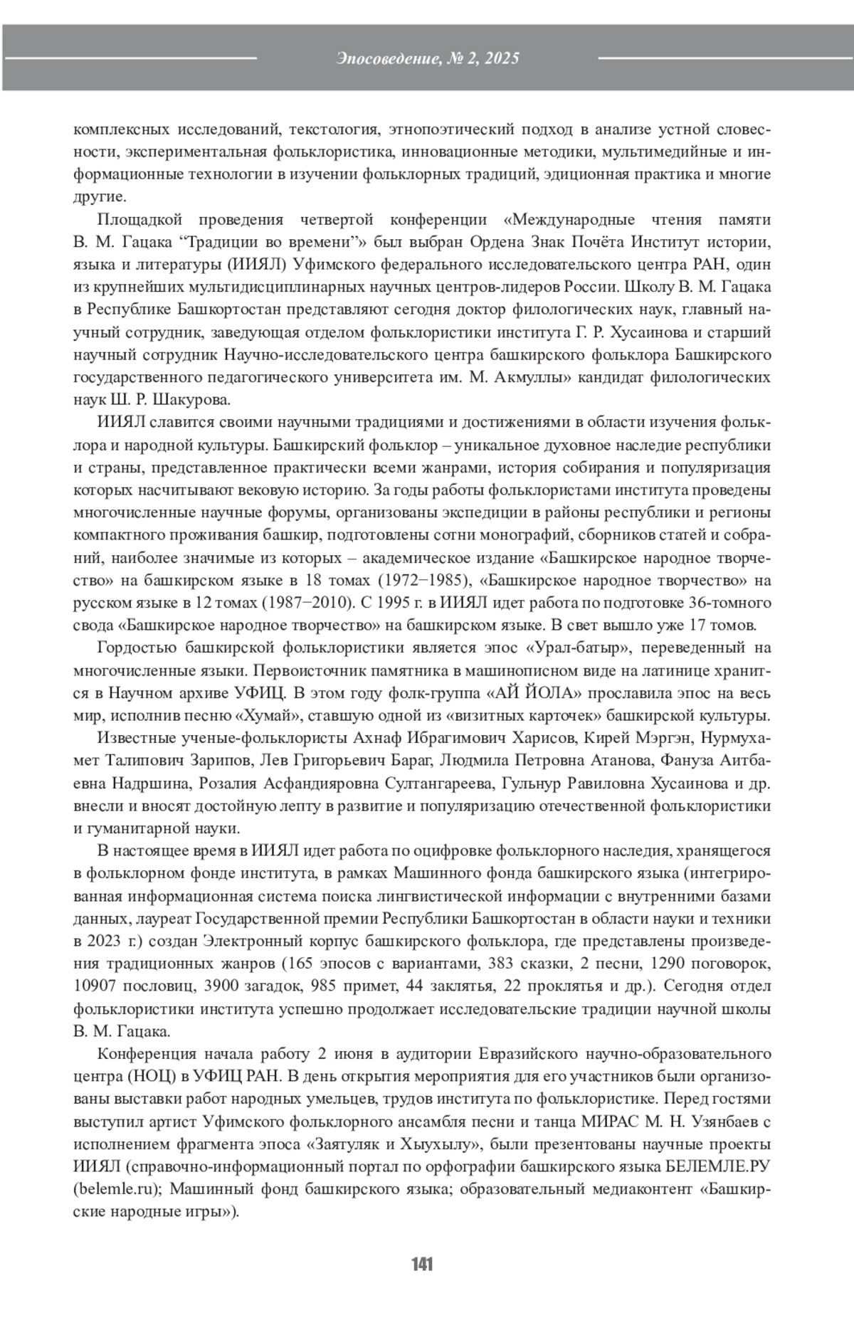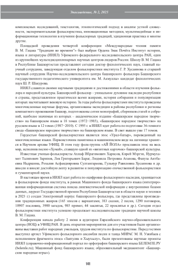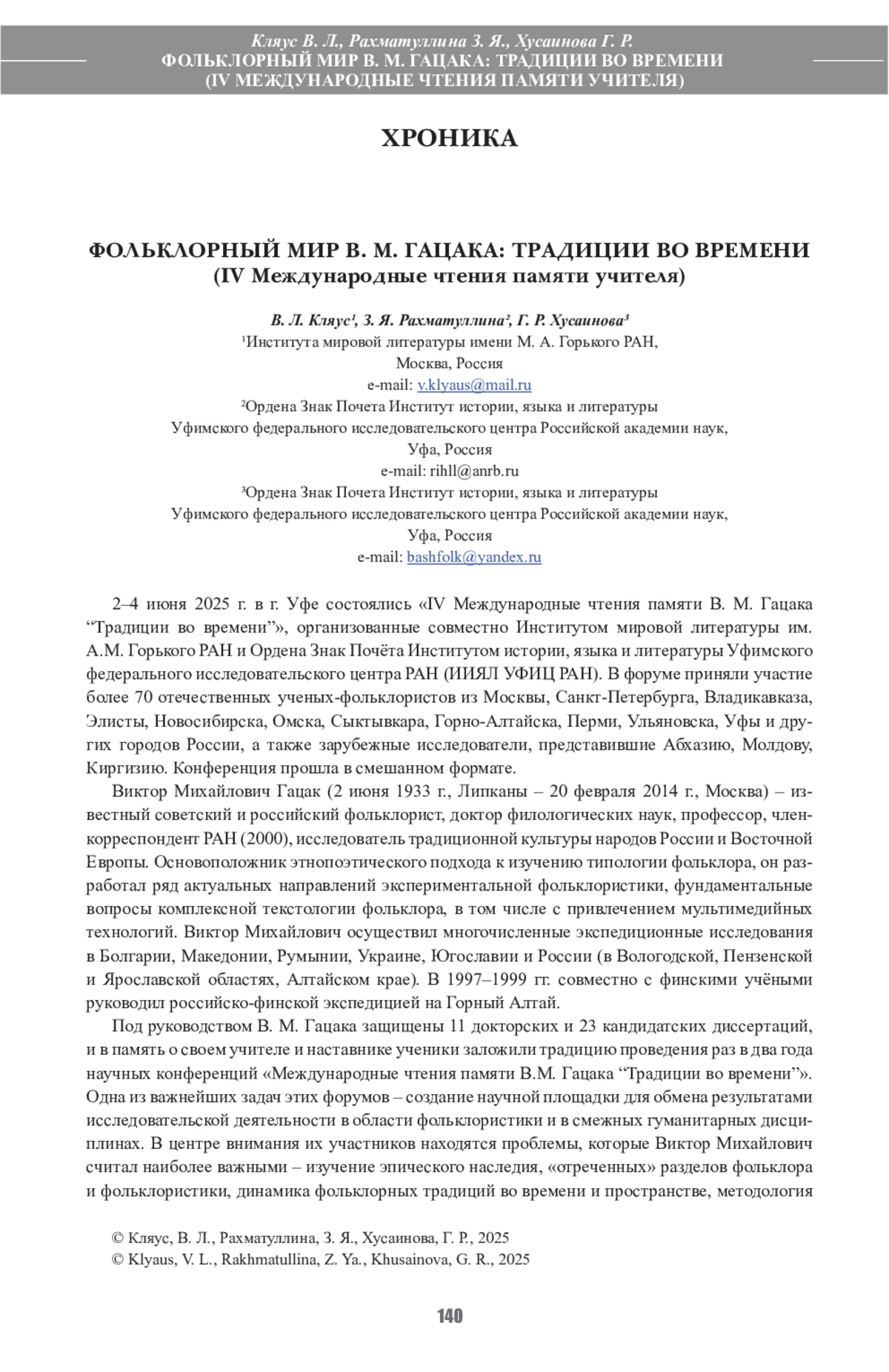 2–4 июня 2025 г. в г. Уфе состоялись «IV Международные чтения памяти В. М. Гацака “Традиции во времени”», организованные совместно Институтом мировой литературы им. А. М. Горького РАН и Ордена Знак Почёта Институтом истории, языка и литературы Уфимского федерального исследовательского центра РАН (ИИЯЛ УФИЦ РАН). В форуме приняли участие более 70 отечественных ученых-фольклористов из Москвы, Санкт-Петербурга, Владикавказа, Элисты, Новосибирска, Омска, Сыктывкара, Горно-Алтайска, Перми, Ульяновска, Уфы и других городов России, а также зарубежные исследователи, представившие Абхазию, Молдову, Киргизию. Конференция прошла в смешанном формате.