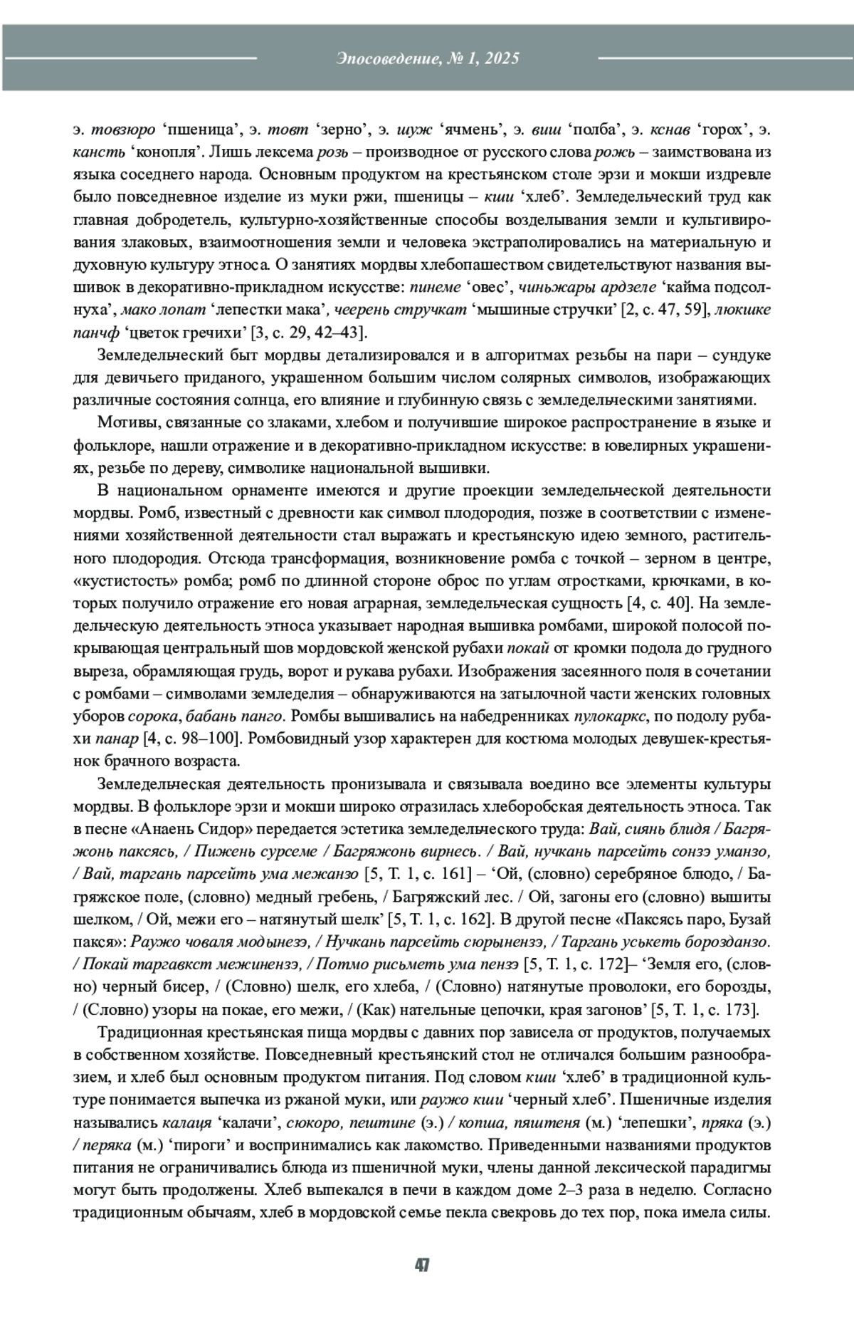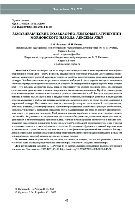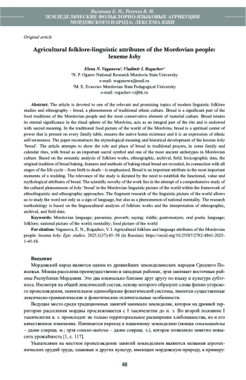 Статья посвящена одной из актуальных и перспективных тем современной лингвофольклористики и этнографии – хлебу, феномену традиционной этнической культуры. Хлеб является значимой частью пищевых традиций мордовского народа и наиболее консервативным элементом материальной культуры. Хлеб сохраняет свое непреходящее значение в обрядовой сфере мордвы, выступает неотъемлемой частью ритуала и наделяется сакральным смыслом. В традиционной пищевой картине мира мордвы хлеб – это духовное средоточие силы, которое присутствует на каждом семейном столе, обеспечивает существование родного дома и является выражением этнического самосознания. В работе реконструируется этимологическое значение и историческое развитие лексемы кши ‘хлеб’. В статье предпринимается попытка показать роль и место хлеба в традиционных молениях, в некоторых семейных и календарных обрядах, связанных с хлебом как важным сакральным символом и одним из самых древних архетипов в мордовской культуре. На основе семантического анализа фольклорных произведений, этнографических, архивных, полевых, лексикографических источников раскрывается самобытная традиция хлебопечения, особенности и способы выпекания обрядового хлеба, подчеркивается его связь со всеми этапами жизненного цикла – от рождения до смерти. Хлеб является важным атрибутом в самых ответственных моментах свадьбы. Актуальность исследования продиктована необходимостью установления функциональных, ценностных и мифологических признаков хлеба. Научная новизна работы заключается в попытке комплексного исследования культурного феномена кши ‘хлеб’ в мордовской языковой картине мира в рамках этнолингвистического и этнографического подходов. Исследование фрагмента языковой картины мира позволяет изучить слово не только как знак языка, но и как феномен национальной ментальности. Методология исследования основана на лингвокультурологическом анализе произведений народного фольклора и интерпретации этнографических, архивных, полевых данных.