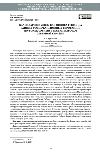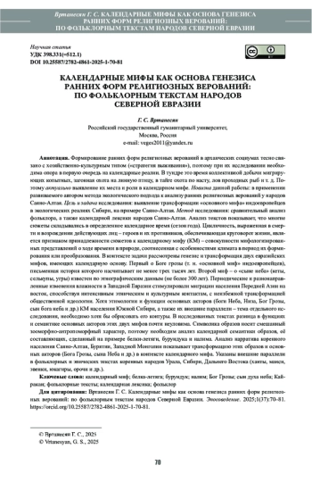 Формирование ранних форм религиозных верований в архаических социумах тесно связано с хозяйственно-культурным типом («стратегия выживания»), поэтому при их исследовании необходима опора в первую очередь на календарные реалии. В тундре это время коллективной добычи мигрирующих копытных, загонная охота на линную птицу, в тайге охота по насту, лов проходных рыб и т. д. Поэтому актуально выявление их места и роли в календарном мифе. Новизна данной работы: в применении развиваемого автором метода экологического подхода к анализу ранних религиозных верований у народов Саяно-Алтая. Цель и задача исследования: выявление трансформации «основного мифа» индоевропейцев в экологических реалиях Сибири, на примере Саяно-Алтая. Метод исследования: сравнительный анализ фольклора, а также календарной лексики народов Саяно-Алтая. Анализ текстов показывает, что многие сюжеты складывались в определенное календарное время (сезон года). Цикличность, выраженная в смерти и возрождении действующих лиц – героев и их противников, обеспечивающая круговорот жизни, является признаком принадлежности сюжетов к календарному мифу (КМ) – совокупности мифологизированных представлений о ходе времени в природе, соотнесенная с особенностями климата в период их формирования или преобразования. В контексте задачи рассмотрены генезис и трансформация двух евразийских мифов, имеющих календарную основу. Первый о Боге грозы (т. н. «основной миф» индоевропейцев), письменная история которого насчитывает не менее трех тысяч лет. Второй миф – о «сыне неба» (кеты, селькупы, угры) известен по этнографическим данным (не более 300 лет). Периодические и разнонаправленные изменения влажности в Западной Евразии стимулировали миграции населения Передней Азии на восток, способствуя интенсивным этническим и культурным контактам, с неизбежной трансформацией общественной идеологии. Хотя этимологии и функции основных акторов (боги Неба, Низа, Бог Грозы, сын бога неба и др.) КМ населения Южной Сибири, а также их внешние параллели – тема отдельного исследования, необходимо хотя бы обрисовать его контуры. В исследованных текстах разница в функциях и семантике основных акторов этих двух мифов почти неуловима. Cимволика образов носит смешанный зооморфно-антропоморфный характер, поэтому необходим анализ календарной семантики образов, её составляющих, сделанный на примере белки-летяги, бурундука и налима. Анализ нарратива коренного населения Саяно-Алтая, Бурятии, Западной Монголии показывает трансформацию этих образов и основных акторов (Бога Грозы, сына Неба и др.) в контексте календарного мифа. Указаны внешние параллели в фольклорных и эпических текстах коренных народов Урала, Сибири, Дальнего Востока (ханты, манси, эвенки, юкагиры, орочи и др.).