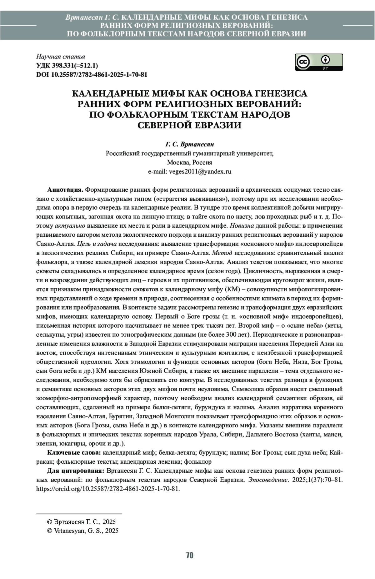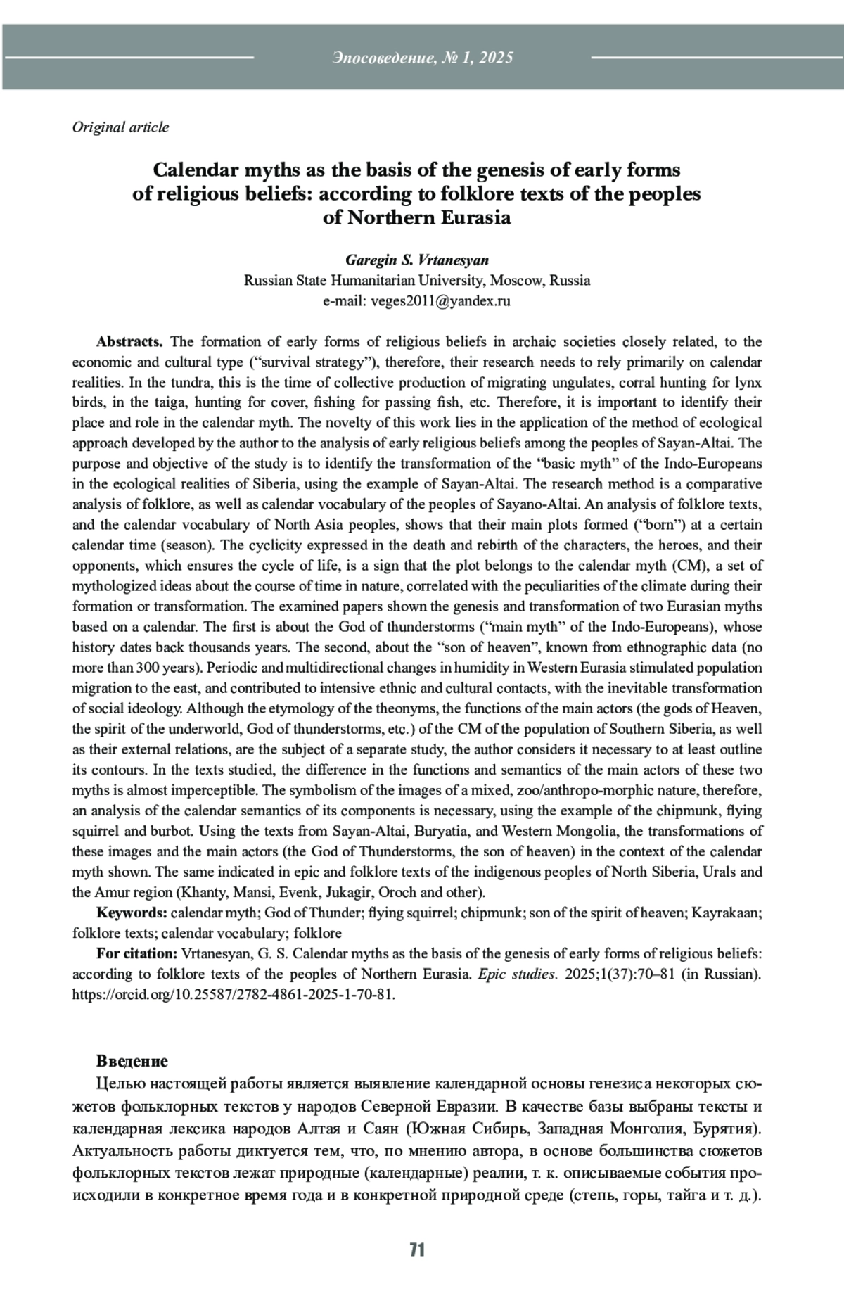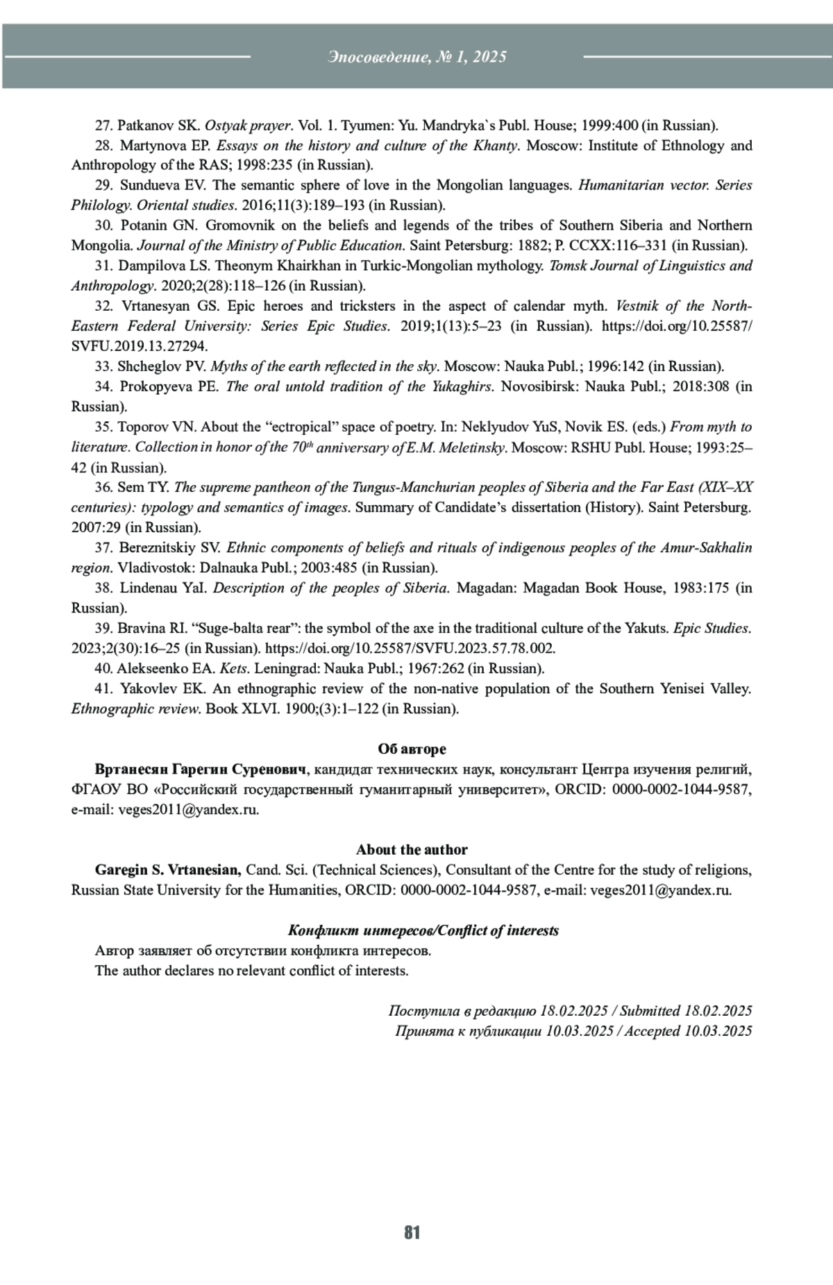 11. Вртанесян Г.С. Вариации “основного мифа” индоевропейцев в Западной Сибири. В кн.: Томилов Н.А. (ред.) Интеграция археологических и этнографических исследований: сборник научных трудов. Омск; Тюмень: “Издатель-Полиграфист”; 2022:8-12.