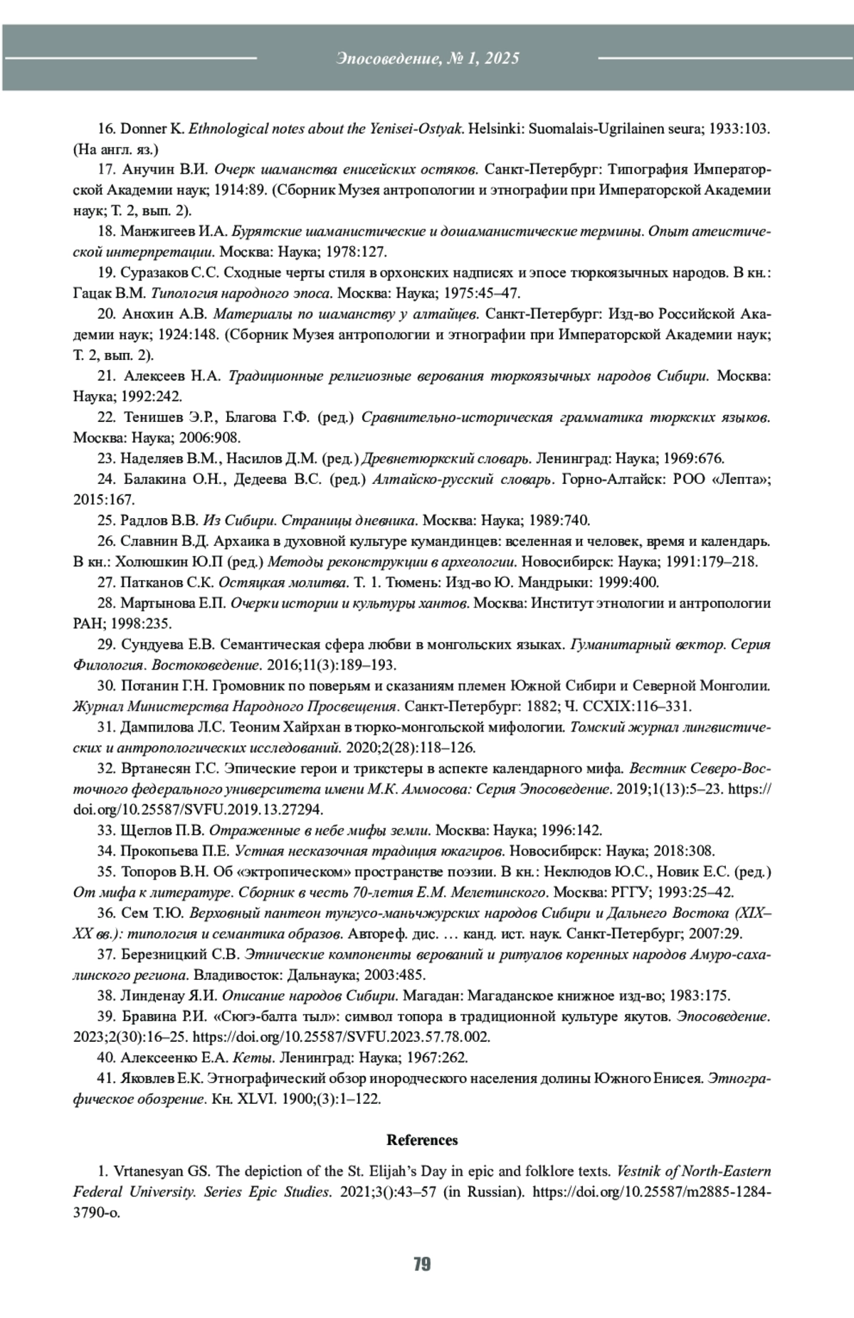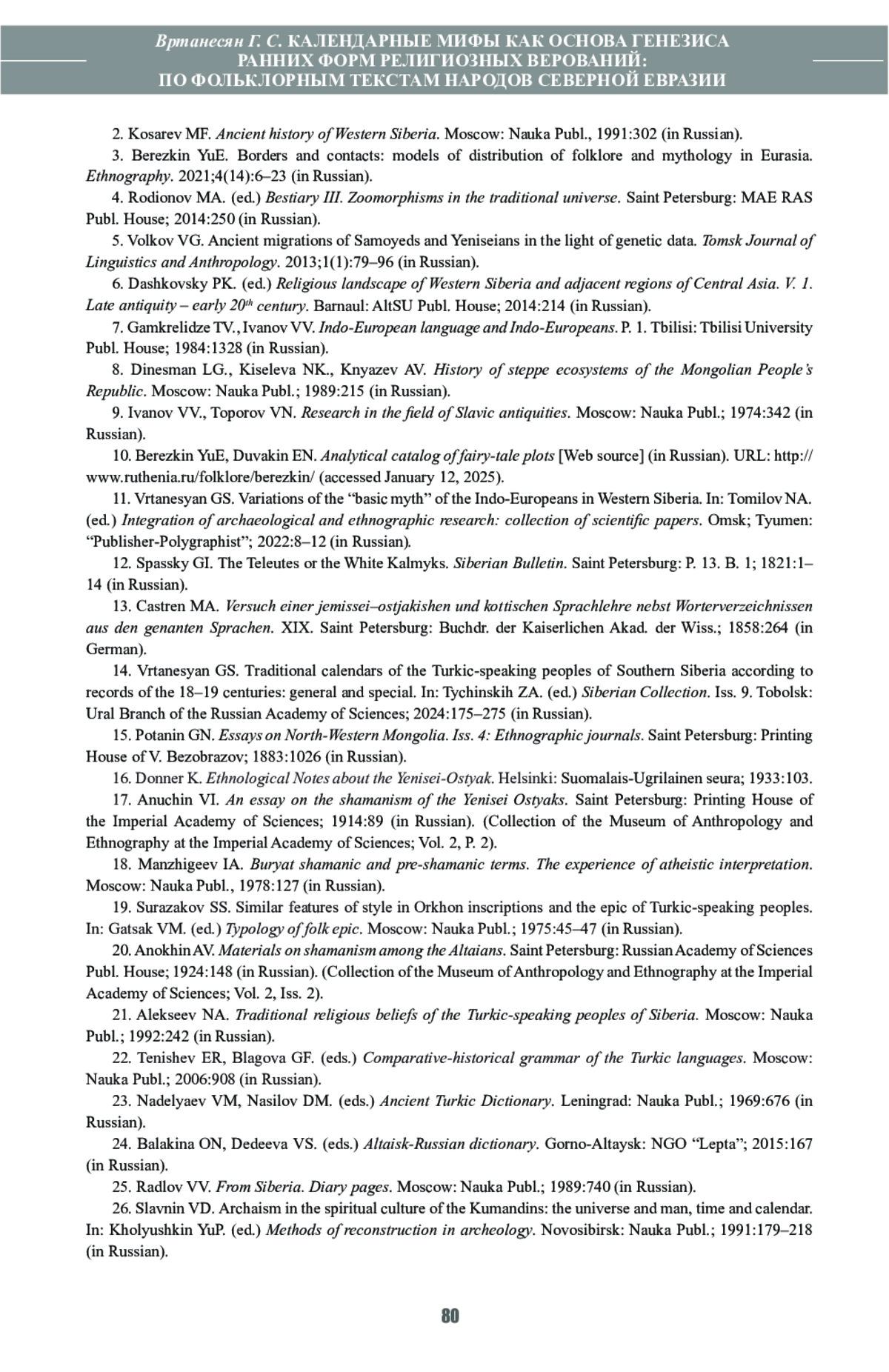 14. Вртанесян Г.С. Традиционные календари тюркоязычных народов Южной Сибири по записям XVIII-XXI вв.: общее и особенное. В кн.: Тычинских З.А. (ред.) Сибирский сборник. Вып. 9. Тобольск: УрО РАН; 2024:175-275.