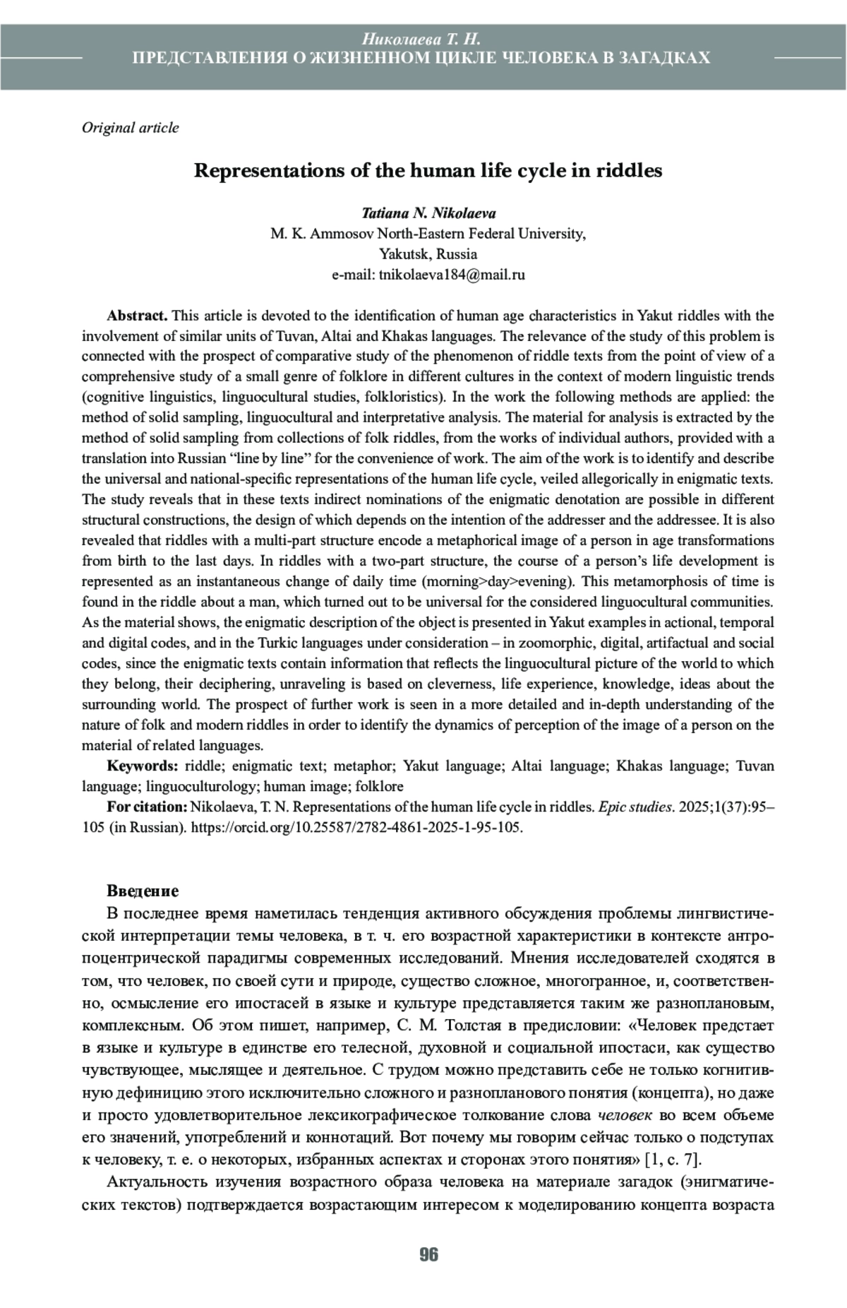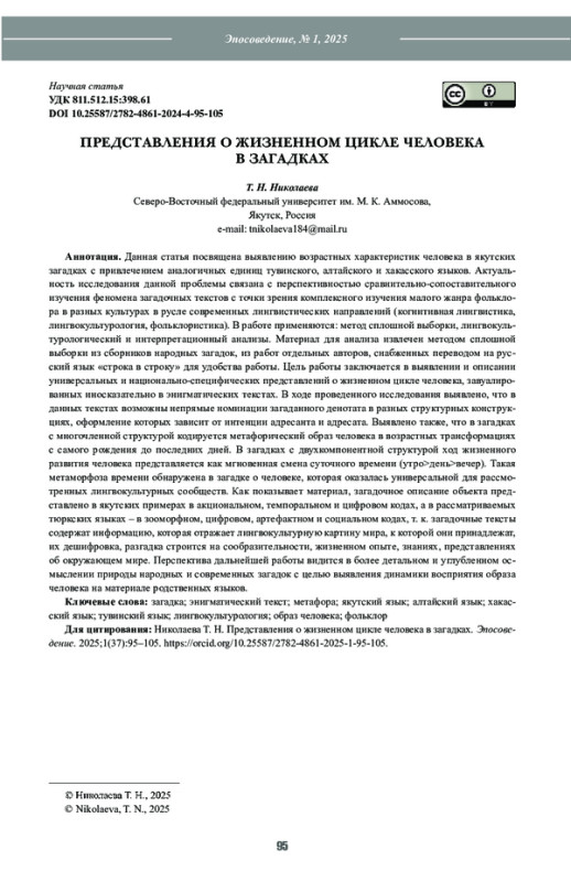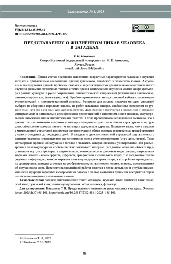 Данная статья посвящена выявлению возрастных характеристик человека в якутских загадках с привлечением аналогичных единиц тувинского, алтайского и хакасского языков. Актуальность исследования данной проблемы связана с перспективностью сравнительно-сопоставительного изучения феномена загадочных текстов с точки зрения комплексного изучения малого жанра фольклора в разных культурах в русле современных лингвистических направлений (когнитивная лингвистика, лингвокультурология, фольклористика). В работе применяются: метод сплошной выборки, лингвокультурологический и интерпретационный анализы. Материал для анализа извлечен методом сплошной выборки из сборников народных загадок, из работ отдельных авторов, снабженных переводом на русский язык «строка в строку» для удобства работы. Цель работы заключается в выявлении и описании универсальных и национально-специфических представлений о жизненном цикле человека, завуалированных иносказательно в энигматических текстах. В ходе проведенного исследования выявлено, что в данных текстах возможны непрямые номинации загаданного денотата в разных структурных конструкциях, оформление которых зависит от интенции адресанта и адресата. Выявлено также, что в загадках с многочленной структурой кодируется метафорический образ человека в возрастных трансформациях с самого рождения до последних дней. В загадках с двухкомпонентной структурой ход жизненного развития человека представляется как мгновенная смена суточного времени (утро>день>вечер). Такая метаморфоза времени обнаружена в загадке о человеке, которая оказалась универсальной для рассмотренных лингвокультурных сообществ. Как показывает материал, загадочное описание объекта представлено в якутских примерах в акциональном, темпоральном и цифровом кодах, а в рассматриваемых тюркских языках – в зооморфном, цифровом, артефактном и социальном кодах, т. к. загадочные тексты содержат информацию, которая отражает лингвокультурную картину мира, к которой они принадлежат, их дешифровка, разгадка строится на сообразительности, жизненном опыте, знаниях, представлениях об окружающем мире. Перспектива дальнейшей работы видится в более детальном и углубленном осмыслении природы народных и современных загадок с целью выявления динамики восприятия образа человека на материале родственных языков.