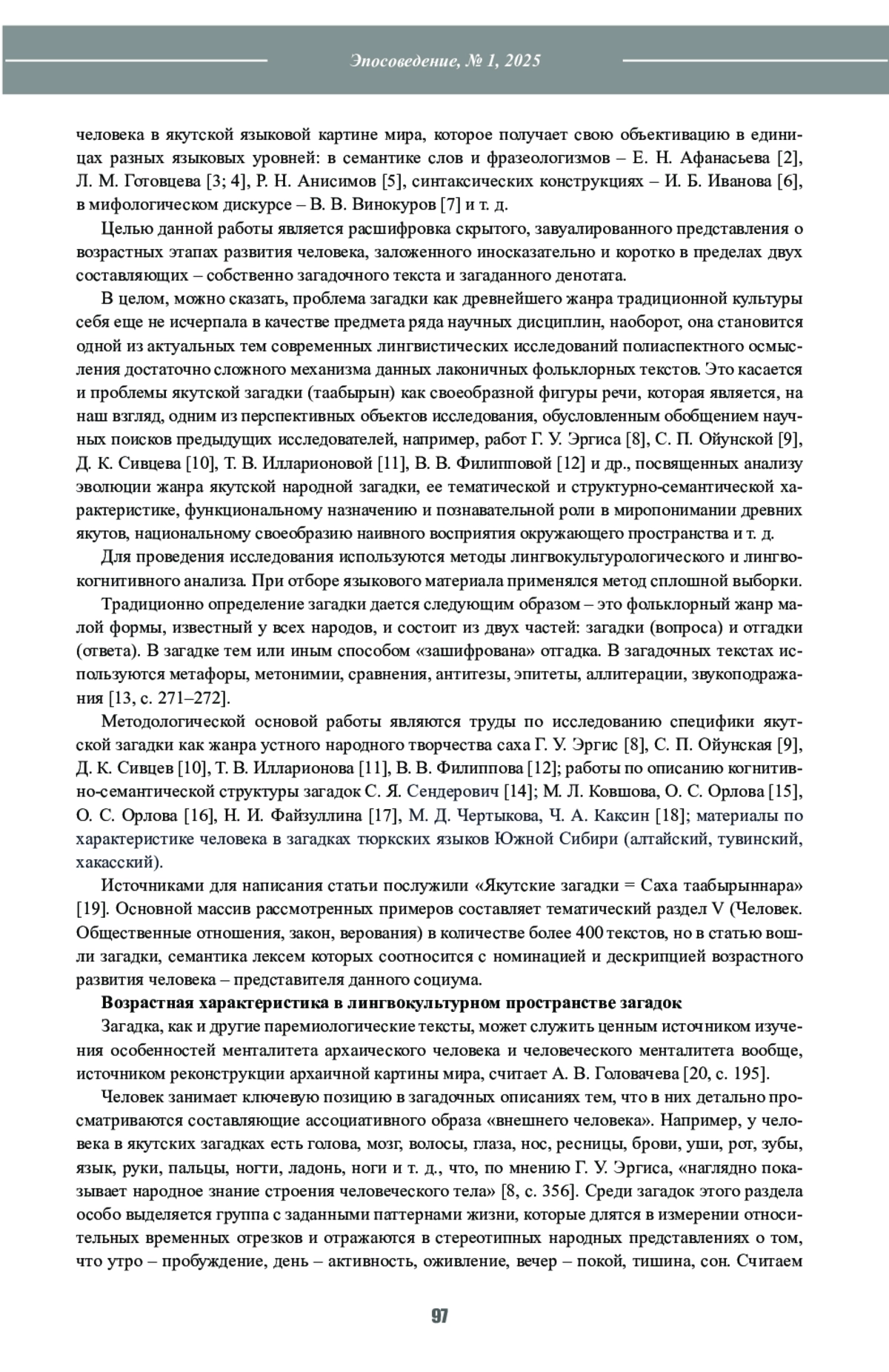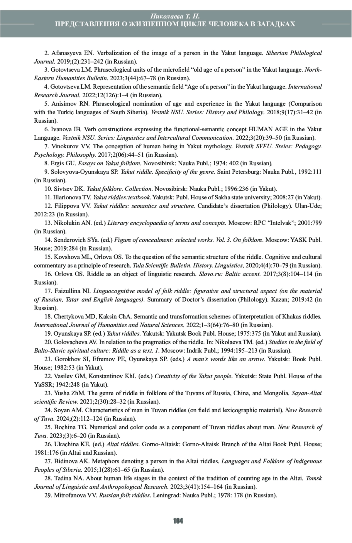 5. Анисимов Р.Н. Фразеологическая номинация возраста и опыта в якутском языке (в сопоставлении с тюркскими языками Южной Сибири). Вестник НГУ. Серия: История, филология. 2018;17(9):31-42.
