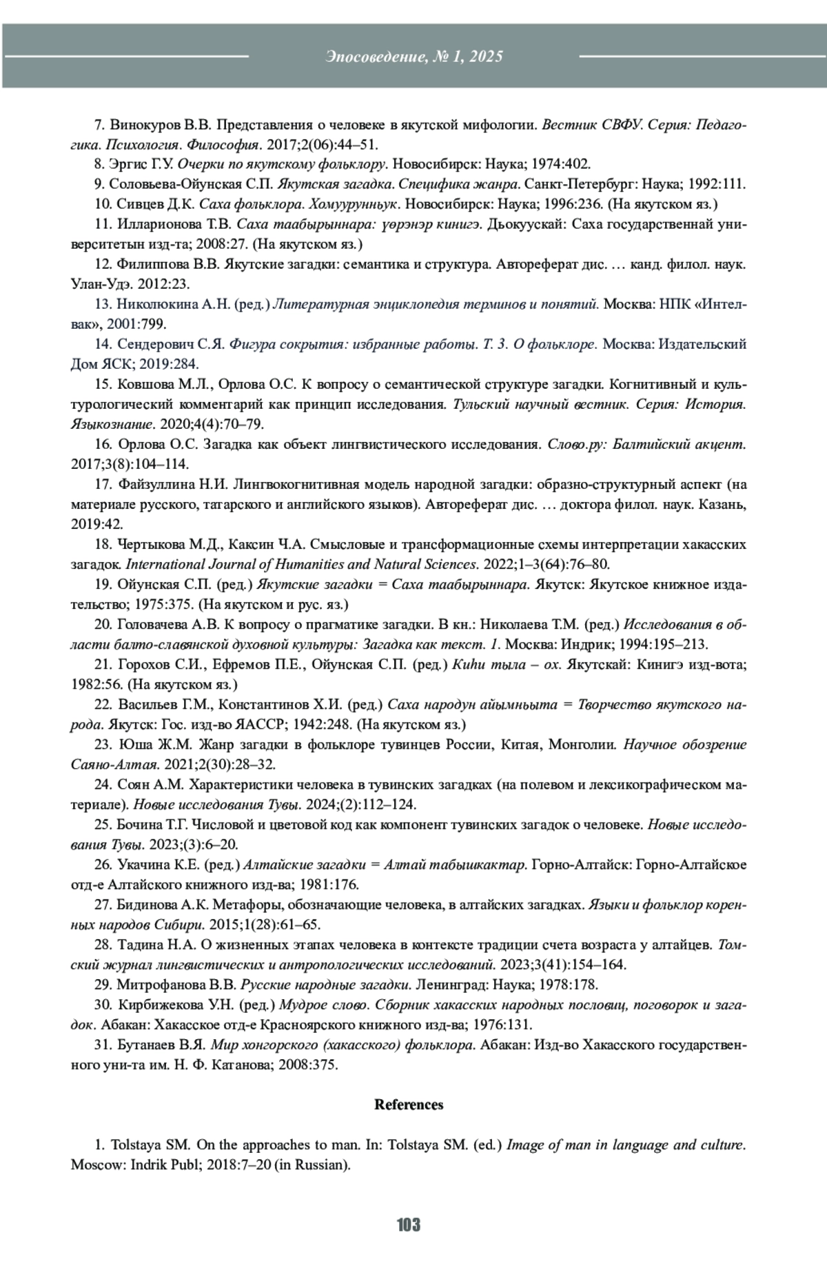 24. Соян А.М. Характеристики человека в тувинских загадках (на полевом и лексикографическом материале). Новые исследования Тувы. 2024;(2):112-124.