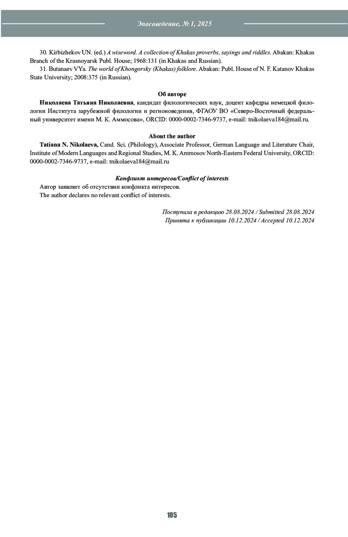31. Бутанаев В.Я. Мир хонгорского (хакасского) фольклора. Абакан: Изд-во Хакасского государственного уни-та им. Н. Ф. Катанова; 2008:375.