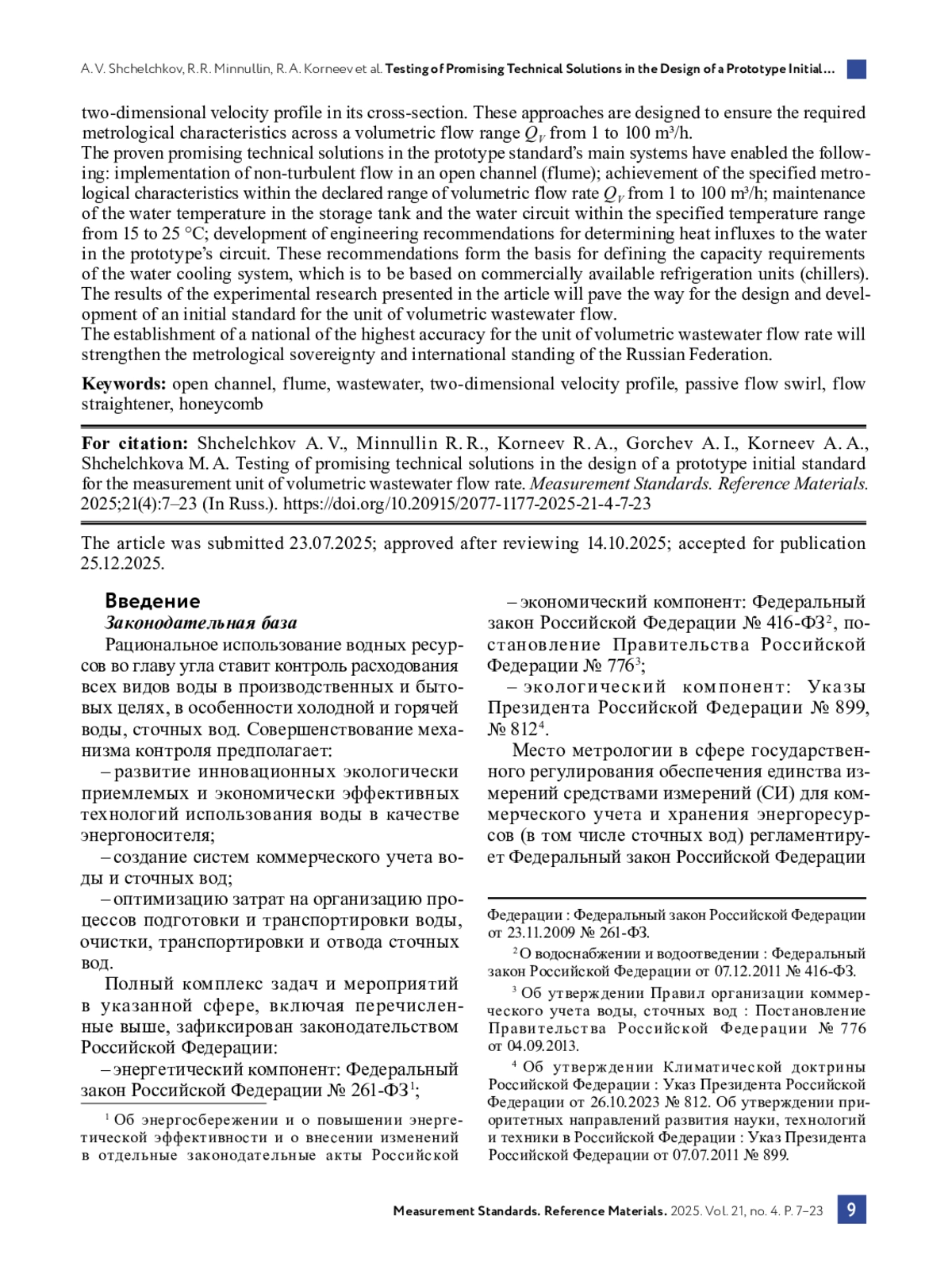 В Российской Федерации идет работа по созданию национального эталона единицы объемного расхода сточных вод наивысшей точности. За основу создания эталона взята практика измерений количества сточных вод в напорных и безнапорных трубопроводах (открытых каналах). При измерениях расхода воды в напорных трубопроводах накоплен значительный опыт и выстроена система метрологического обеспечения средств измерений. Однако измерения расхода воды в безнапорных трубопроводах – пока достаточно сложная метрологическая задача в силу гидродинамических особенностей формирования безнапорного небурного потока воды и недостатков существующей системы метрологического обеспечения.