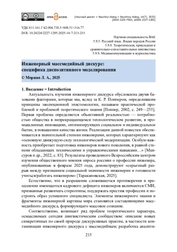 Проведена лингвориторическая реконструкция механизмов диспозитивного моделирования текстов, ориентированных на популяризацию инженерного знания в массмедиа и составляющих периферию инженерного дискурса. Утверждается, что такие медиатексты путем следования риторическим стратегиям призваны формировать новое понимание передовых инженерных практик, менять традиционный образ инженера в массовом сознании, способствовать повышению престижа инженерного образования. На предварительном этапе исследования проведен входной эксперимент, верифицирующий тенденцию доминирования сегодня в сознании молодежи стереотипных устаревших представлений об инженере и его функционале. На основном этапе исследования осуществлена лингвориторическая реконструкция способов и средств воплощения диспозитивной стратегии текстообразования, определяющей структурно-композиционную организацию текста и его персуазивный потенциал. Описана макроструктура медиатекстов об инженерии, сформированная вокруг заголовочного комплекса; выявлен модельный характер макроструктуры, ее воспроизводимость; сделаны наблюдения над топическим составом макроструктуры. Реконструированы три модели аргументации, обеспечивающие обновление взглядов на инженерию и инженера: доказательного, нарративного и аналогического типов.