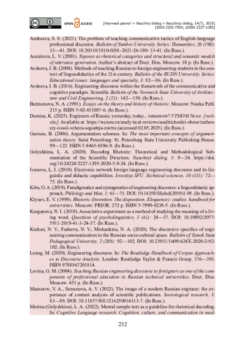4. Андреева С. С. Проблема обучения коммуникативным тактикам англоязычного профессионального дискурса / С. С. Андреева // Вестник Тамбовского университета. Серия : Гуманитарные науки. - 2021. - Т. 26. - № 190. - С. 33-41. - https://doi.org/10.20310/1810-0201-2021-26-190- 33-41.