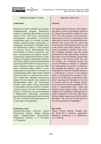 Изучается история создания системы фортификационной обороны Хинганского тоннеля на Китайско-Восточной железной дороге в 1914—1918 годах. Актуальность исследования обусловлена отсутствием специальных работ по истории долговременных оборонительных сооружений, защищающих восточный и западный порталы Хинганского тоннеля, а также виадук на разъезде Петля. Источниковую базу исследования составили документы текущего делопроизводства Главного военно-технического управления Военного министерства и Главного управления Генерального штаба. В работе рассмотрены проекты строительства бетонных блокгаузов для защиты порталов тоннеля и разъезда. Вводятся в научный оборот данные о последовательности, масштабах и стоимости запланированных работ. Представлен общий обзор хода работ по строительству указанных сооружений. Впервые публикуются данные об изготовлении двух комплектов бронированных ворот для Хинганского тоннеля. Дана оценка итогам реализации в годы войны столь масштабного оборонительного проекта. В статье подчеркивается ценность блокгаузов как расположенных в Маньчжурии уникальных памятников русской военно-инженерной школы начала XX века. Указывается на необходимость их сохранения и музеефикации.