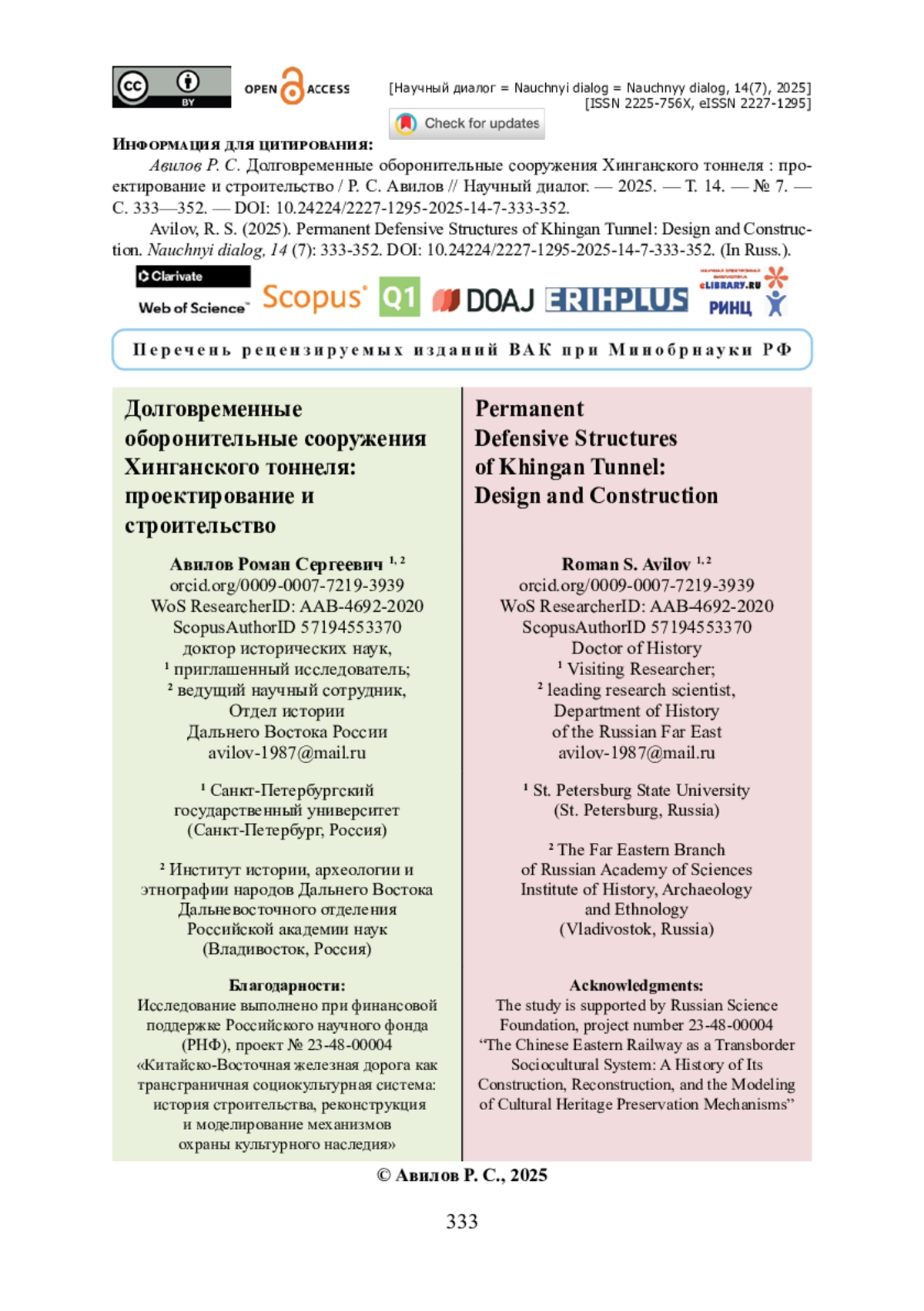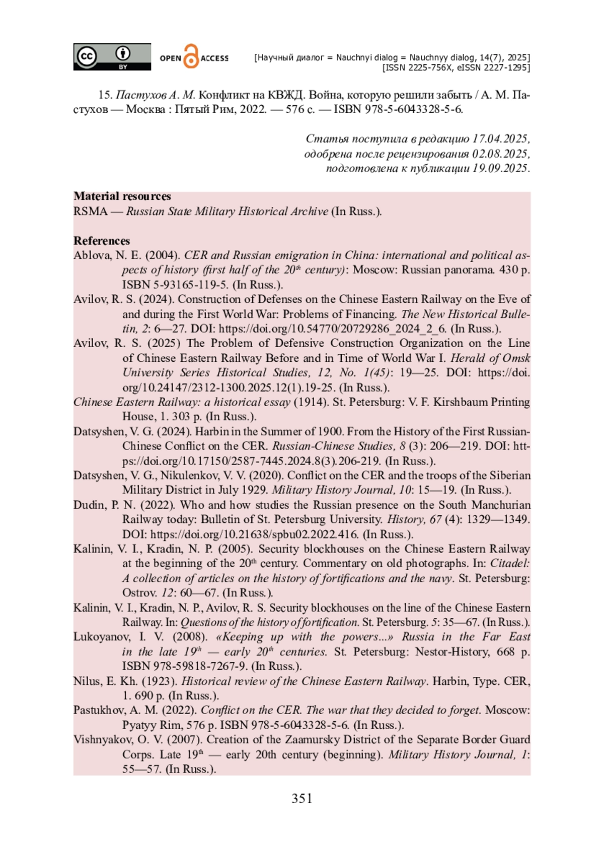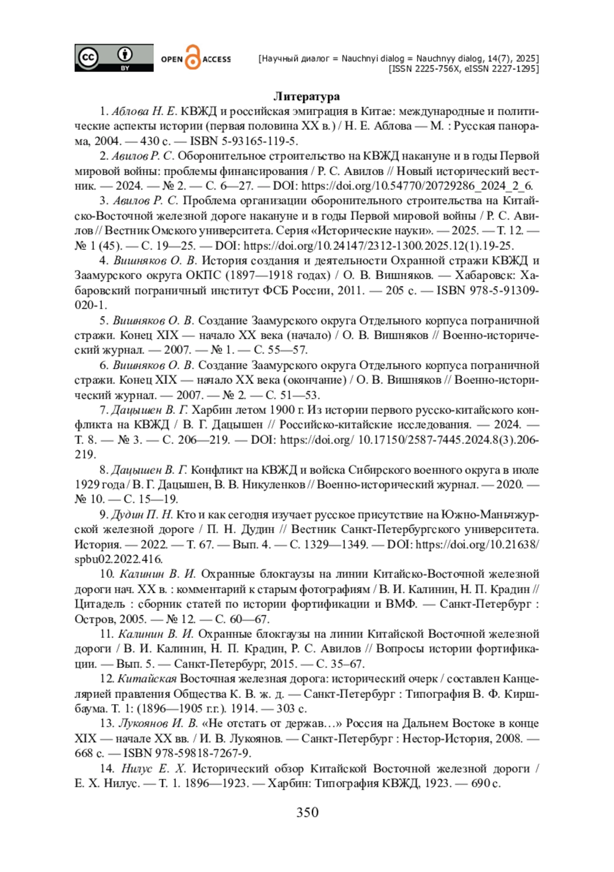 3. Авилов Р. С. Проблема организации оборонительного строительства на Китайско-Восточной железной дороге накануне и в годы Первой мировой войны / Р. С. Авилов // Вестник Омского университета. Серия «Исторические науки». - 2025. - Т. 12. - № 1 (45). - С. 19-25. - https://doi.org/10.24147/2312-1300.2025.12(1).19-25.