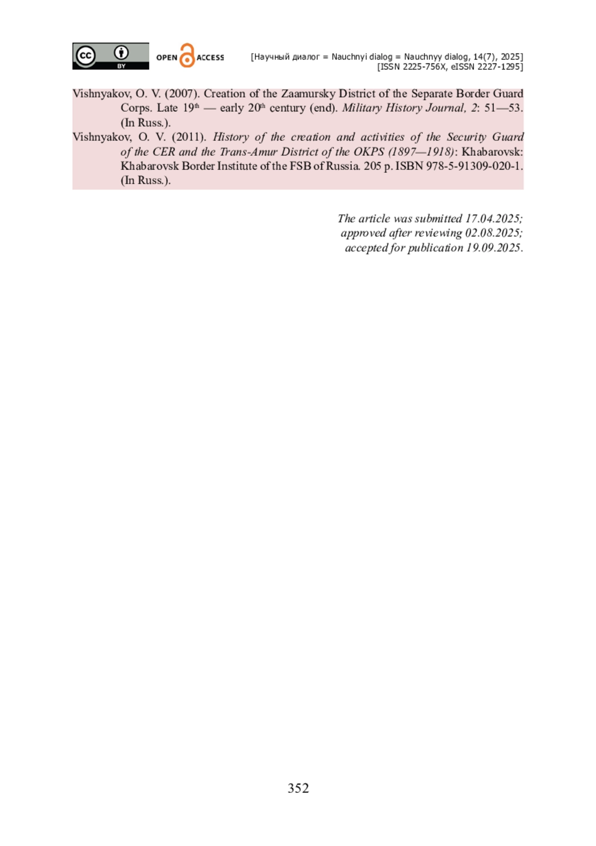 6. Вишняков О. В. Создание Заамурского округа Отдельного корпуса пограничной стражи. Конец XIX - начало XX века (окончание) / О. В. Вишняков // Военно-исторический журнал. - 2007. - № 2. - С. 51-53.