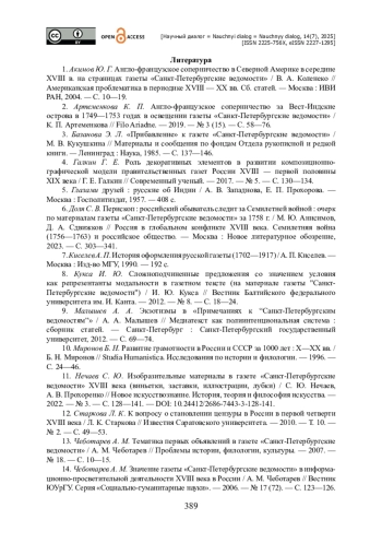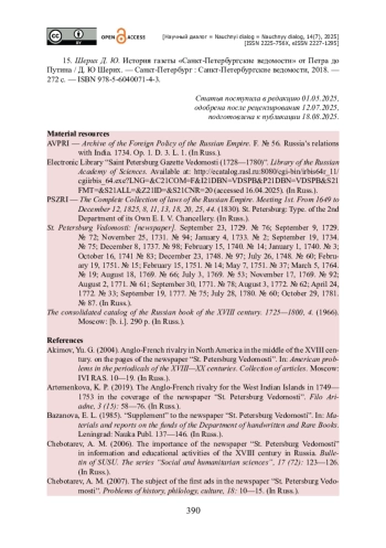 2. Артеменкова К. П. Англо-французское соперничество за Вест-Индские острова в 1749-1753 годах в освещении газеты «Санкт-Петербургские ведомости» / К. П. Артеменкова // Filo Ariadne. - 2019. - № 3 (15). - С. 58-76.