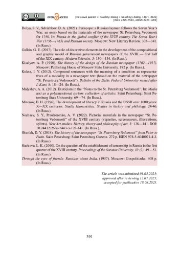 6. Доля С. В. Перископ : российский обыватель следит за Семилетней войной : очерк по материалам газеты «Санкт-Петербургские ведомости» за 1758 г. / М. Ю. Анисимов, Д. А. Сдвижков // Россия в глобальном конфликте XVIII века. Семилетняя война (1756-1763) и российское общество. - Москва : Новое литературное обозрение, 2023. - С. 303-341.