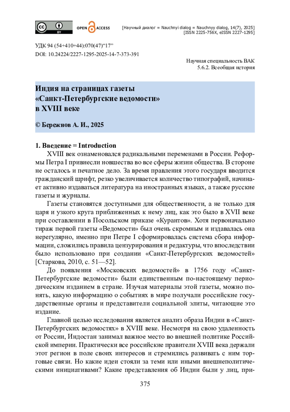 Статья посвящена анализу образа Индии на страницах первой российской периодической газеты «Санкт-Петербургские ведомости». В качестве материалов привлекаются выпуски газеты за период с 1728 по 1781 годы, которые были оцифрованы и размещены в открытом доступе Библиотекой Российской академии наук. На основе этих данных автором была подсчитана периодичность новостей об Индии, выделены ключевые тематики новостей и определены основные источники этой информации. Автор приходит к выводу о том, что в XVIII веке информация об Индии регулярно печаталась в «Санкт-Петербургских ведомостях». Доказано, что главным источником сведений об Индии были сообщения, получаемые через Европу. Для анализа тематики новостей было выделено 9 смысловых блоков. Показано, что в указанный период у российского общества могли сложиться общие представления о внешней политике западноевропейских держав, в частности Великобритании и Франции, на Индостане, о торговле с этим регионом и деятельности Ост-Индских компаний. Автор утверждает, что традиции, культура и быт индийцев практически не описываются в газете. Подчеркивается, что сведения об Индии могли иметь ошибки и неточности, а также содержать необъективные оценки событий, заимствованные у европейцев.