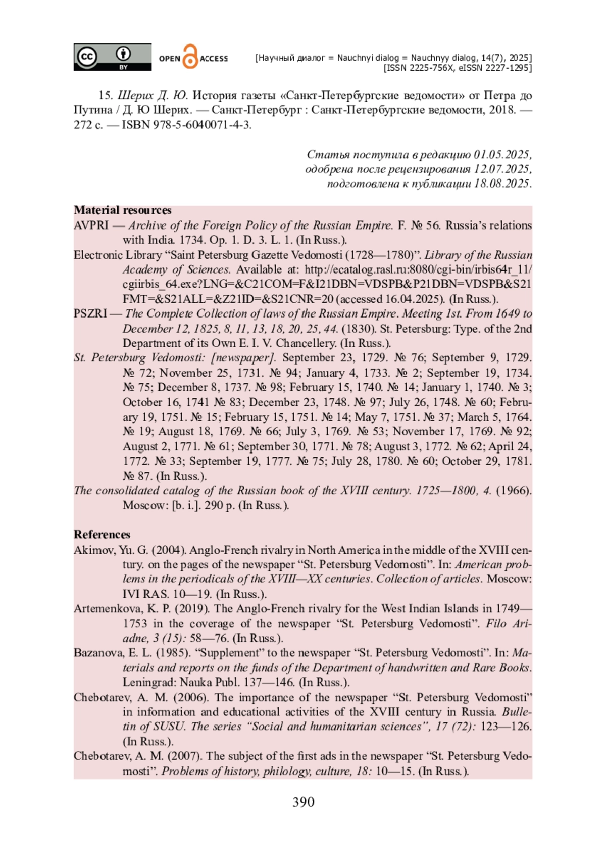 15. Шерих Д. Ю. История газеты «Санкт-Петербургские ведомости» от Петра до Путина / Д. Ю Шерих. - Санкт-Петербург : Санкт-Петербургские ведомости, 2018. - 272 с. - ISBN 978-5-6040071-4-3.