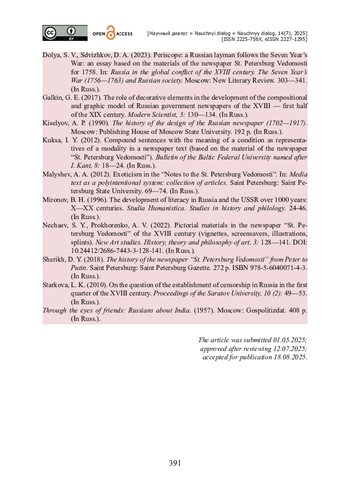 11. Нечаев С. Ю. Изобразительные материалы в газете «Санкт-Петербургские ведомости» XVIII века (виньетки, заставки, иллюстрации, лубки) / С. Ю. Нечаев, А. В. Прохоренко // Новое искусствознание. История, теория и философия искусства. - 2022. - № 3. - С. 128-141. - https://doi.org/10.24412/2686-7443-3-128-141.