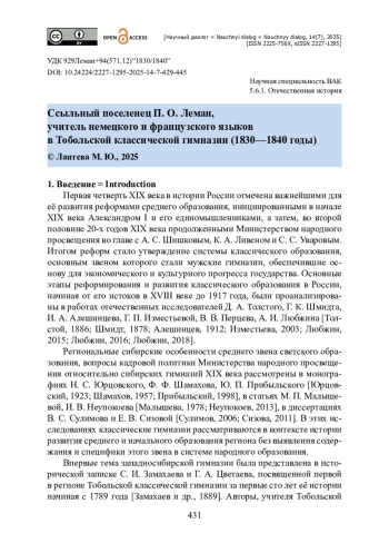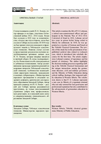 Статья посвящена судьбе П. О. Лемана, унтер-офицера в отставке, участника Отечественной войны 1812—1814 годов. Леман был осужден в 1822 году за мошенничество, отсидел два года в тюрьме, затем был сослан в Сибирь на поселение. В 1830 году он был принят учителем немецкого и французского языков в Тобольскую классическую гимназию. Новизна статьи состоит в представлении результатов изучения неопубликованных архивных данных дела П. О. Лемана, которые впервые вводятся в научный оборот. В статье подчеркивается, что Леман нашел в себе силы раскаяться и добиваться помилования. Автор уделяет внимание процедуре принятия решений по кадровым вопросам Тобольской классической гимназии, особенностям взаимодействия директоров гимназии, гражданских и военных губернаторов с Министерством народного просвещения в ситуациях кадрового дефицита, критических для народного образования Западной Сибири. Автор приходит к выводу, что П. О. Леман — редкий для Сибири пример раскаявшегося преступника, не только восстановивший утраченное доброе имя, профессиональную репутацию, но и внесший свою лепту в совершенствование гимназического образования Западной Сибири.