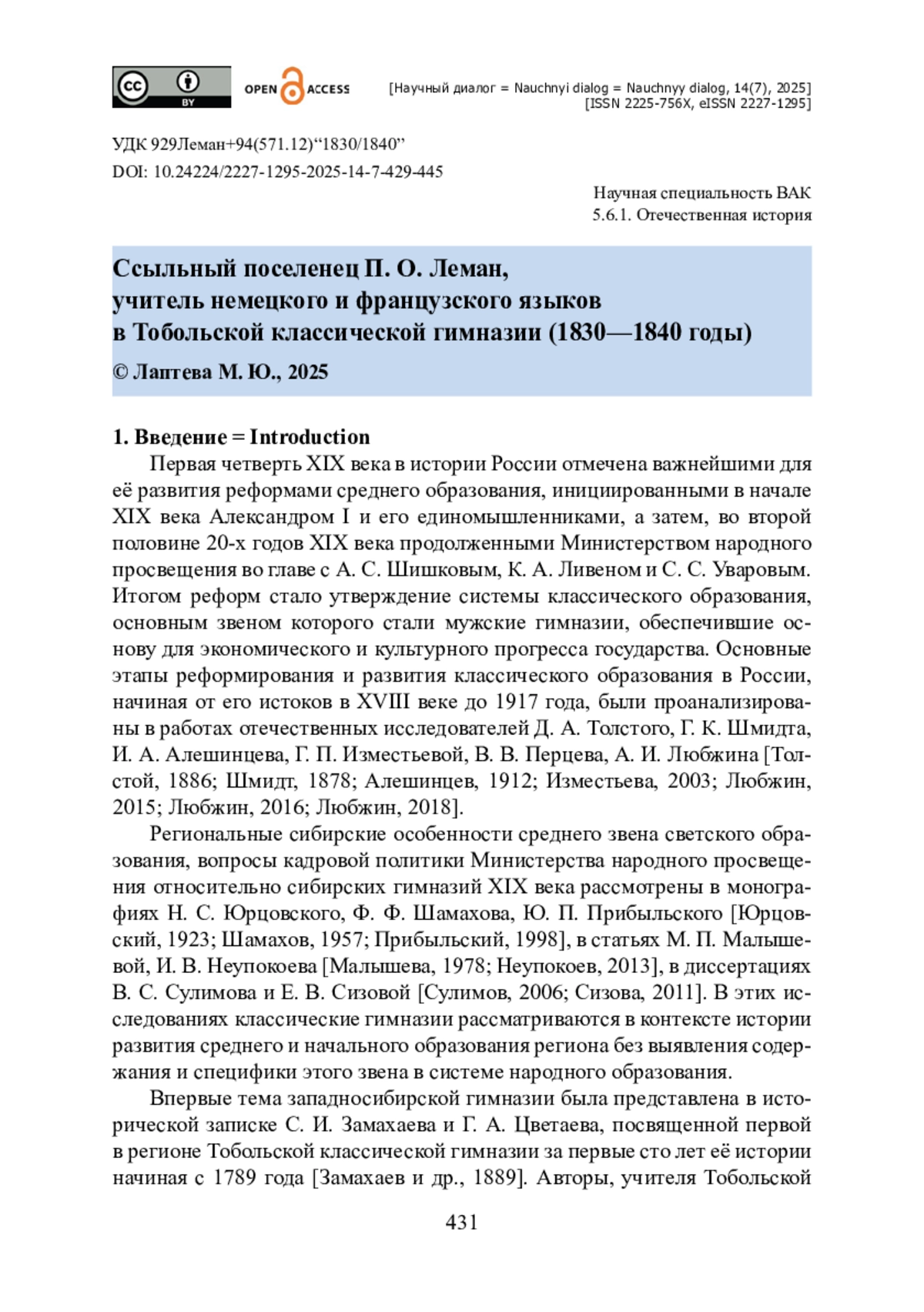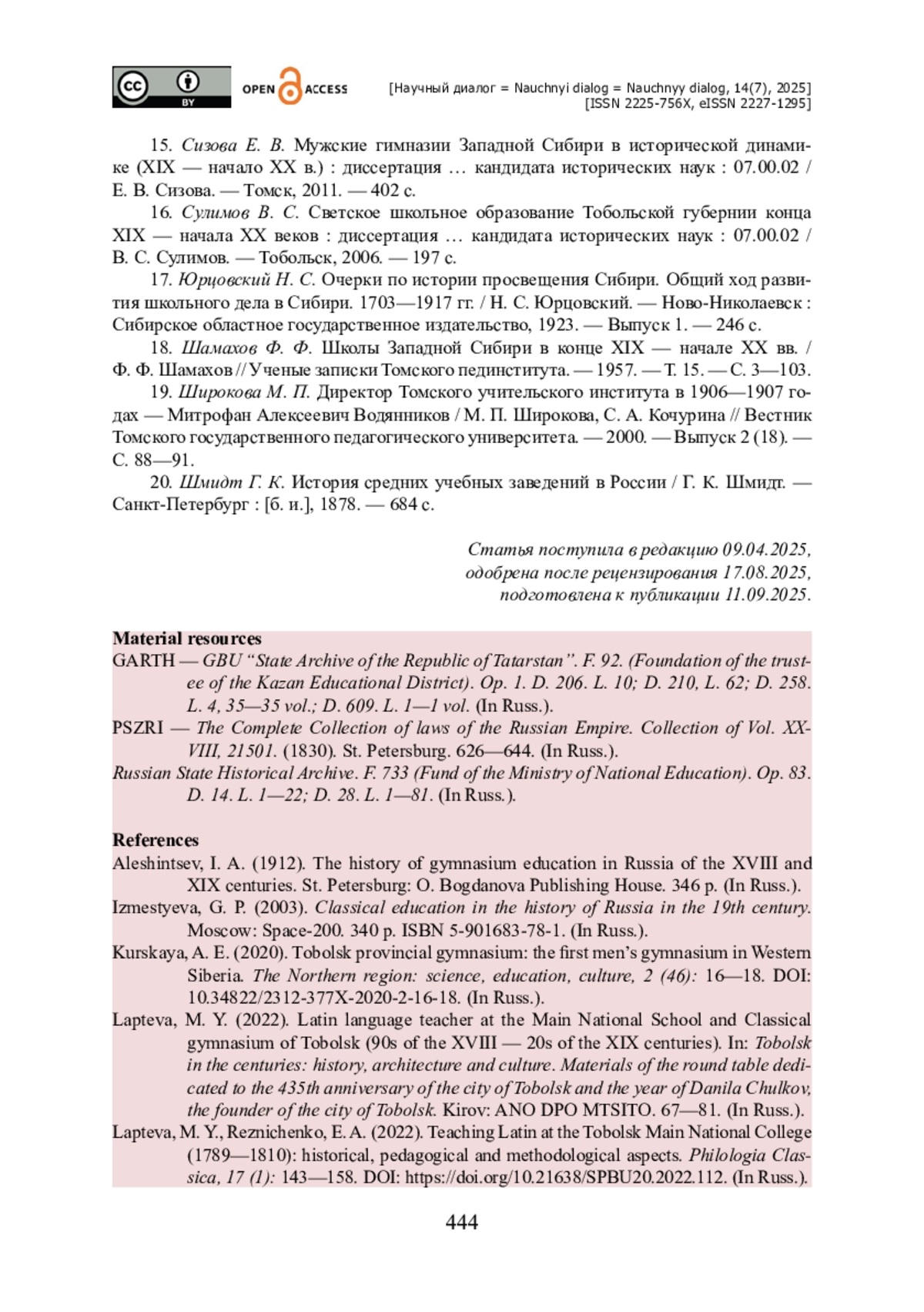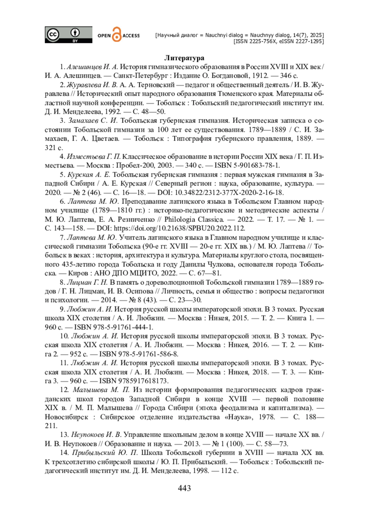 7. Лаптева М. Ю. Учитель латинского языка в Главном народном училище и классической гимназии Тобольска (90-е гг. XVIII - 20-е гг. XIX вв.) / М. Ю. Лаптева // Тобольск в веках : история, архитектура и культура. Материалы круглого стола, посвященного 435-летию города Тобольска и году Данилы Чулкова, основателя города Тобольска. - Киров : АНО ДПО МЦИТО, 2022. - С. 67-81.