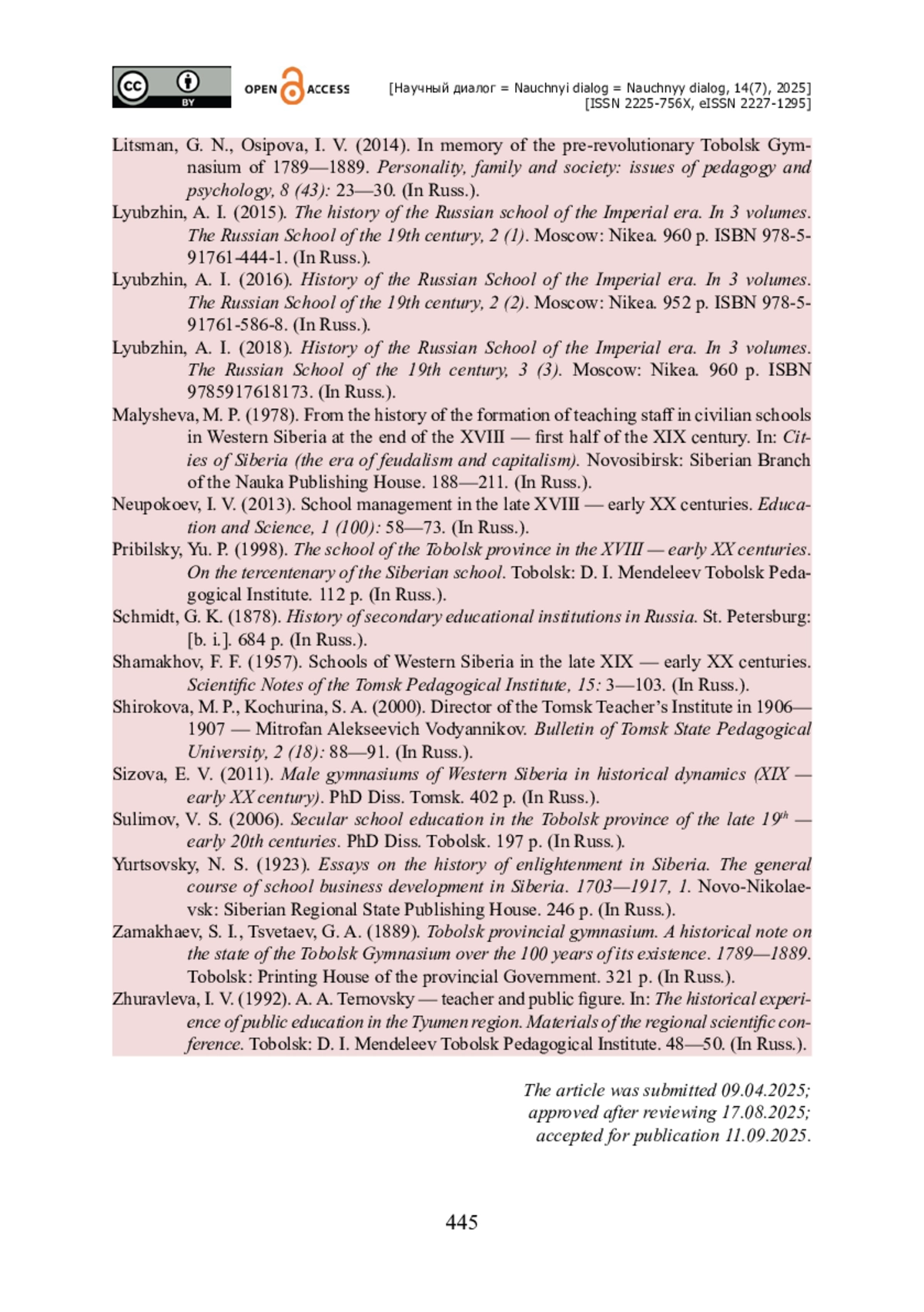 8. Лицман Г. Н. В память о дореволюционной Тобольской гимназии 1789-1889 годов / Г. Н. Лицман, И. В. Осипова // Личность, семья и общество : вопросы педагогики и психологии. - 2014. - № 8 (43). - С. 23-30.