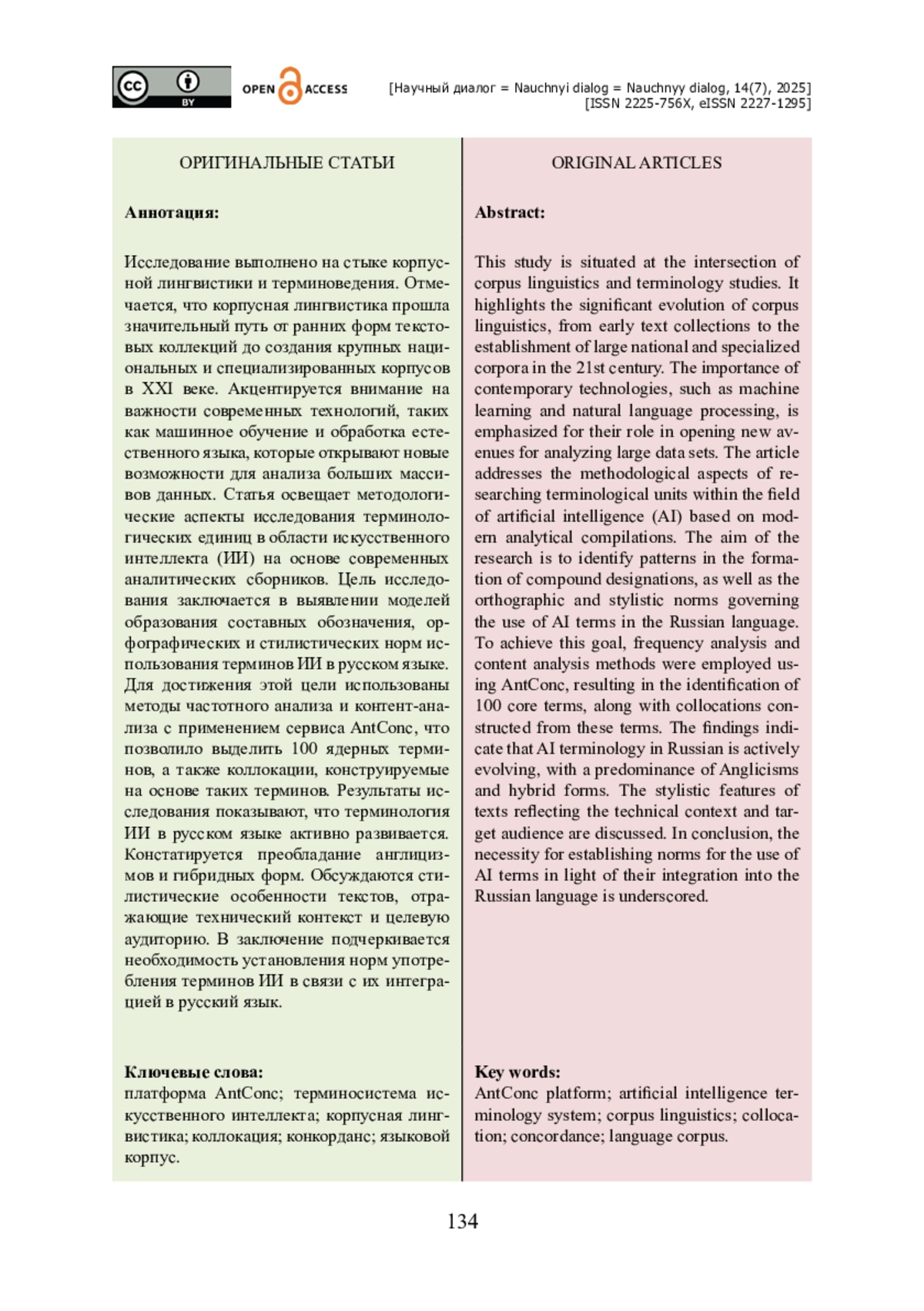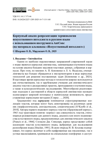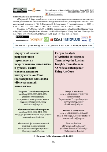 Исследование выполнено на стыке корпусной лингвистики и терминоведения. Отмечается, что корпусная лингвистика прошла значительный путь от ранних форм текстовых коллекций до создания крупных национальных и специализированных корпусов в XXI веке. Акцентируется внимание на важности современных технологий, таких как машинное обучение и обработка естественного языка, которые открывают новые возможности для анализа больших массивов данных. Статья освещает методологические аспекты исследования терминологических единиц в области искусственного интеллекта (ИИ) на основе современных аналитических сборников. Цель исследования заключается в выявлении моделей образования составных обозначения, орфографических и стилистических норм использования терминов ИИ в русском языке. Для достижения этой цели использованы методы частотного анализа и контент-анализа с применением сервиса AntConc, что позволило выделить 100 ядерных терминов, а также коллокации, конструируемые на основе таких терминов. Результаты исследования показывают, что терминология ИИ в русском языке активно развивается. Констатируется преобладание англицизмов и гибридных форм. Обсуждаются стилистические особенности текстов, отражающие технический контекст и целевую аудиторию. В заключение подчеркивается необходимость установления норм употребления терминов ИИ в связи с их интеграцией в русский язык.