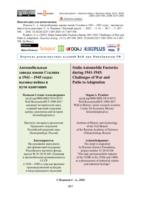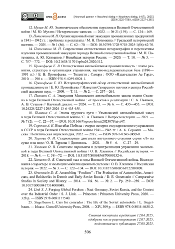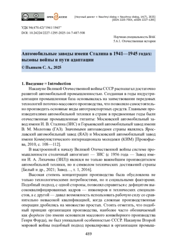 Исследуется функционирование автомобильных заводов имени Сталина в период Великой Отечественной войны, их эвакуация, реорганизация и адаптация к условиям военного времени. Рассматриваются вопросы управления производством, технологической кооперации и преодоления кризисных ситуаций. Цель исследования заключается в анализе процессов эвакуации и реорганизации автомобильной промышленности СССР, а также в оценке эффективности управления производством в условиях войны. В качестве источников использованы архивные документы из фондов Российского государственного архива экономики, Российского государственного архива социально-политической истории и других архивов, включая распорядительные, отчетные и статистические материалы. Применены методы ретроспективного анализа, контент-анализа и статистической обработки данных. Автор приходит к выводу о том, что эвакуация Московского автомобильного завода имени Сталина и создание новых предприятий на Урале и в Поволжье позволили сохранить производственный потенциал автомобильной промышленности. Установлено, что организация Главного управления автозаводов имени Сталина (Глававтозис) способствовала координации работы разрозненных предприятий. Показано, что накопленный в ходе войны опыт управления автомобильной промышленностью и конструкторские разработки были использованы для послевоенного восстановления страны.