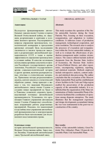 Исследуется функционирование автомобильных заводов имени Сталина в период Великой Отечественной войны, их эвакуация, реорганизация и адаптация к условиям военного времени. Рассматриваются вопросы управления производством, технологической кооперации и преодоления кризисных ситуаций. Цель исследования заключается в анализе процессов эвакуации и реорганизации автомобильной промышленности СССР, а также в оценке эффективности управления производством в условиях войны. В качестве источников использованы архивные документы из фондов Российского государственного архива экономики, Российского государственного архива социально-политической истории и других архивов, включая распорядительные, отчетные и статистические материалы. Применены методы ретроспективного анализа, контент-анализа и статистической обработки данных. Автор приходит к выводу о том, что эвакуация Московского автомобильного завода имени Сталина и создание новых предприятий на Урале и в Поволжье позволили сохранить производственный потенциал автомобильной промышленности. Установлено, что организация Главного управления автозаводов имени Сталина (Глававтозис) способствовала координации работы разрозненных предприятий. Показано, что накопленный в ходе войны опыт управления автомобильной промышленностью и конструкторские разработки были использованы для послевоенного восстановления страны.