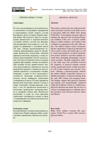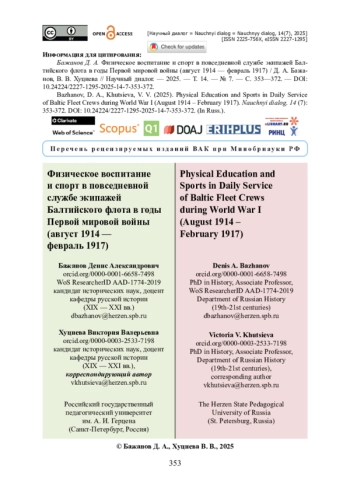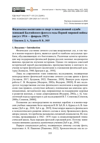 В статье рассматривается роль физического воспитания и спортивных мероприятий в повседневной службе личного состава Балтийского флота в период Первой мировой войны. Исследуются меры по поддержанию физического и морально-волевого состояния личного состава как факторы, обеспечивающие боеготовность, и их эволюция по сравнению с ситуацией начала XX века. Авторы проанализировали источники, фиксировавшие меры по организации физического воспитания экипажей (приказы, вахтенные журналы), а также наглядно представлявшие участие в реализации этих мер и отношение к ним со стороны моряков (фотографии, личные источники). При помощи метода сравнительного анализа прослеживается зависимость частоты проведения занятий от активности использования кораблей и соединений в боевых операциях, а также от мест дислокации и сезонности. Благодаря историко-генетическому методу выявляется взаимосвязь сложившихся в начале XX века принципов физической подготовки личного состава и новых тенденций. Авторы приходят к выводу о том, что физическое воспитание и подготовка проводились преимущественно в традициях начала века. Физическое воспитание и спорт не стали фактором укрепления солидарности команд в связи с сохранявшейся кастовой разделенностью матросов и офицеров.