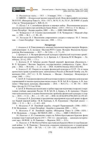 10. Павленко А. И. Становление спорта на Рабоче-Крестьянском Красном флоте в первые годы Советской власти (1917-1921 гг.) : диссертация … кандидата исторических наук : 00.00.00 / А. И. Павленко. - Воронеж, 2022. - 212 с.