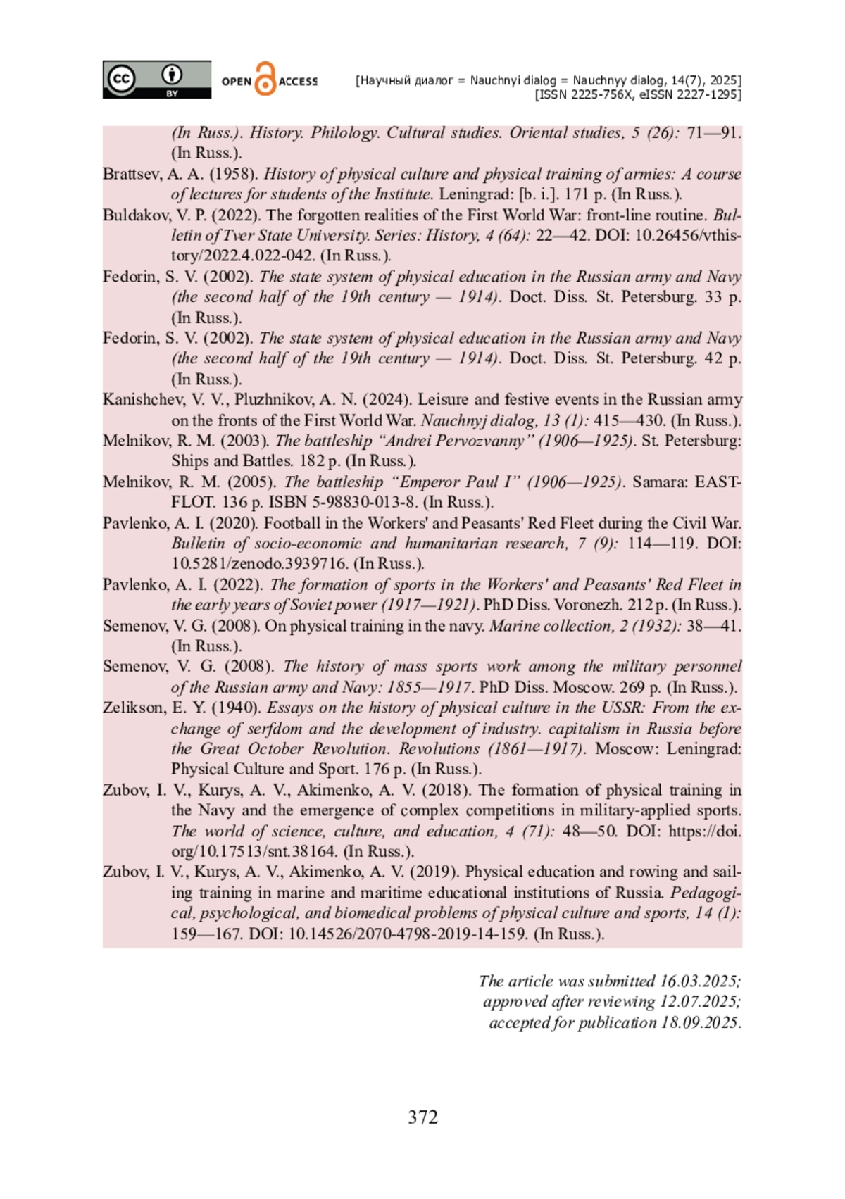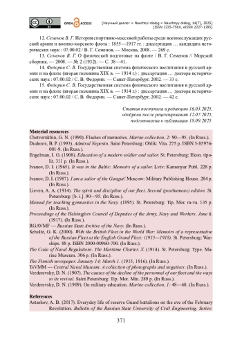 11. Павленко А. И. Футбол на Рабоче-крестьянском Красном Флоте в годы Гражданской войны / А. И. Павленко // Бюллетень социально-экономических и гуманитарных исследований. - 2020. - № 7 (9). - С. 114-119. - https://doi.org/10.5281/zenodo.3939716.