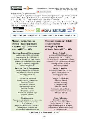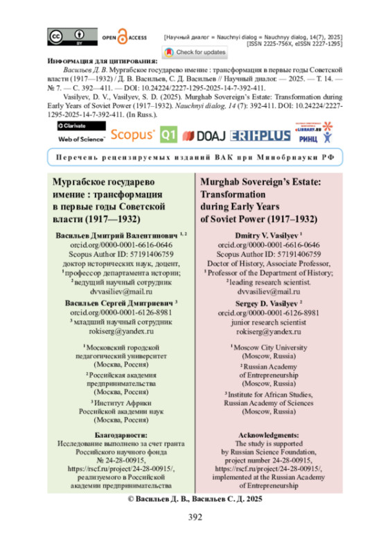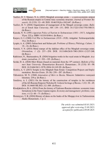3. Васильев Д. В. Мургабское государево имение - социально-экономический форпост российской империи в Центральной Аазии: экономическая структура / Д. В. Васильев, Н. А. Мазаев // Журнал фронтирных исследований. - 2025. - Т. 10. - № 2 (38). - С. 32-48. https://doi.org/10.46539/jfs.v10i2.647.