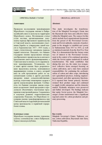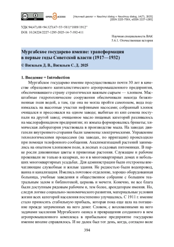 Проведено исследование трансформации Мургабского государева имения в Байрамалийский совхоз и колхозы на территории Мургабского оазиса. Источниками статьи стали местные организационные документы периода Временного правительства и Советской власти, воспоминания участников борьбы за утверждение новой власти в Туркменистане 1917—1935 годов, а также статистические материалы периода первой пятилетки. Показано, что бывшее государево имение представляло интерес для Временного правительства в контексте продолжения своего функционирования, а Советская власть взялась за его кардинальную трансформацию. Установлено, что в новое время имение было реорганизовано: выделились колхозы, занимавшиеся выращиванием хлопка, и совхоз, который взял на себя продолжение работ по акклиматизации хлопка и других растений, внедрение новых сельскохозяйственных культур, подготовку инженерных кадров и другие агрокультурные функции. Сообщается, что бывшие удельные заводы сохранили ассортимент своей продукции и продолжали обеспечивать текстильные предприятия и внутренний рынок. Сохранились и получили развитие гидротехнические сооружения. Показано, что Мургабское государево имение трансформировалось при Советской власти в крупный региональный центр производства и первичной переработки хлопка.