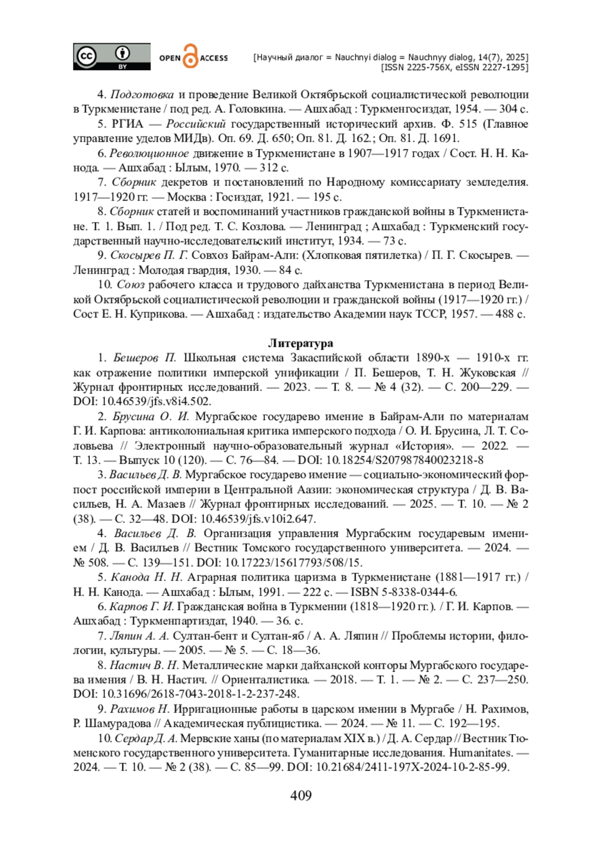 10. Сердар Д. А. Мервские ханы (по материалам XIX в.) / Д. А. Сердар // Вестник Тюменского государственного университета. Гуманитарные исследования. Humanitates. - 2024. - Т. 10. - № 2 (38). - С. 85-99. https://doi.org/10.21684/2411-197X-2024-10-2-85-99.