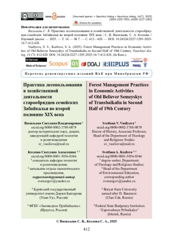 Выполнен анализ мероприятий, осуществляемых лесничествами Забайкальской области, и практики использования лесных ресурсов старообрядцами семейскими в своей хозяйственной деятельности во второй половине XIX века. Привлекались опубликованные и неопубликованные источники. Корпус неопубликованных источников включает материалы делопроизводственного и нормативно-правового характера о состоянии лесного дела в Забайкальской области, хранящиеся в Государственном архиве Иркутской области. Комплексный анализ источников позволил рассмотреть историю формирования территориального устройства лесопользования в Забайкальской области, где расположены семейские поселения. Внимание сосредоточено на территории Троицко-Савского лесничества, границы которого проходили в пределах Верхнеудинского округа и частично в Троицко-Савском округе, где были расположены поселения старообрядцев семейских. Авторы останавливаются на интересных фактах о наиболее ресурсных с точки зрения лесопользования участках, например о Малханском участке с наличием орехово-промысловых угодий. Выявлены проблемы лесопользования у старообрядцев, проживавших в пределах Кяхтинской дачи. Отмечается, что в Забайкальской области до 1890 года не были организованы лесничества и не было специальных учреждений, занимавшихся управлением лесными ресурсами, что приводило к неравномерному использованию лесных ресурсов и влияло на систему жизнеобеспечения старообрядческих сообществ.