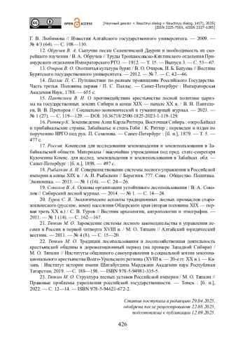 8. Курышова И. В. Охрана сибирских лесов в законодательстве Российской империи XVIII - начала ХХ века / И. В. Курышова // Академический юридический журнал. - 2020. - № 1 (79). - С. 48-54.