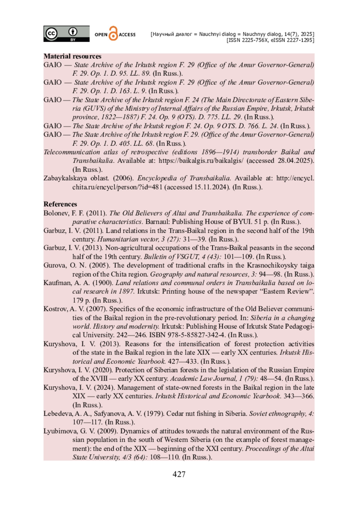 7. Курышова И. В. Причины активизации лесоохранной деятельности государства в Байкальском регионе в конце XIX - начале ХХ вв. / И. В. Курышова // Иркутский историко-экономический ежегодник. - 2013. - С. 427-433.