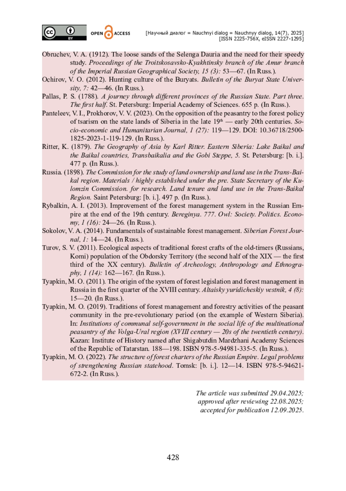 15. Пантелеев В. И. О противодействии крестьянства лесной политике царизма на государственных землях Сибири в конце XIX - начале ХХ в. / В. И. Пантелеев, В. В. Прохоров // Социально-экономический и гуманитарный журнал. - 2023. - № 1 (27). - С. 119-129. - https://doi.org/10.36718/2500-1825-2023-1-119-129.