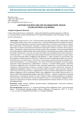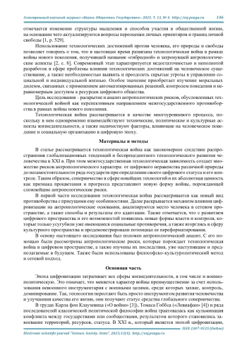 Материалы и методы. В основу настоящего исследования был положен антропологический анализ. С его помощью были рассмотрены антропологические риски, которые порождает технологическая война в цифровом пространстве, а также изучены их последствия, уже наступившие и предполагаемые в будущем. Также были использованы философско-культурологический метод и сетевой подход.