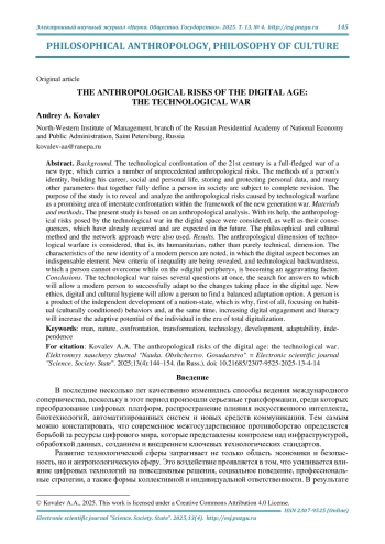 Результаты. Рассмотрено антропологическое измерение технологической войны, т. е. ее гуманитарное, а не сугубо техническое, измерение. Отмечены характеристики новой идентичности современного человека, в которой обязательным элементом становится цифровой аспект. Раскрыты новые критерии неравенства, усугубляющим фактором становится технологическая отсталость, которую человек не сможет преодолеть, находясь на «цифровой периферии».