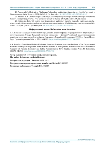 20. Хейфец Б. А. Глобализация 4.0 и Россия // Научные труды Вольного экономического общества России. 2019. Т. 218, № 4. С. 288-296. EDN: HENRPX