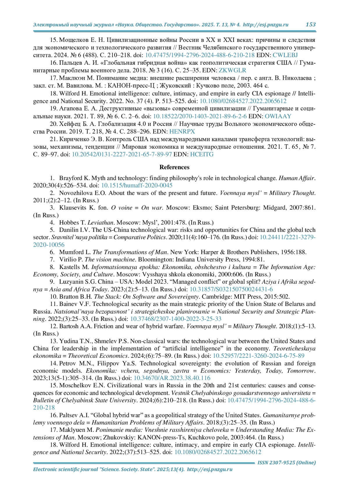 15. Мощелков Е. Н. Цивилизационные войны России в XX и XXI веках: причины и следствия для экономического и технологического развития // Вестник Челябинского государственного университета. 2024. № 6 (488). С. 210-218. DOI: 10.47475/1994-2796-2024-488-6-210-218 EDN: CWLEBJ