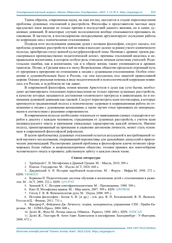 Результаты. В ходе данного исследования было выявлено, что первоначально проблема душевных отклонений рассматривалась с педагогических позиций, как недостаток воспитания. В поздние периоды авторы сосредоточились на критике подходов коррекции и отношения общества к людям с отклонениями. Изучение работ современных философов показывает, что душевные отклонения в современном обществе приобрели новые интересные нюансы, требующие систематизации. Анализ философских аспектов душевных отклонений человека проводился на основе общефилософской диалектической методологии, дополненной рассмотрением связи душевных отклонений человека и социальности с помощью социально-антропологического метода, а взаимовлияния культуры и общества - с помощью социокультурной методологии.