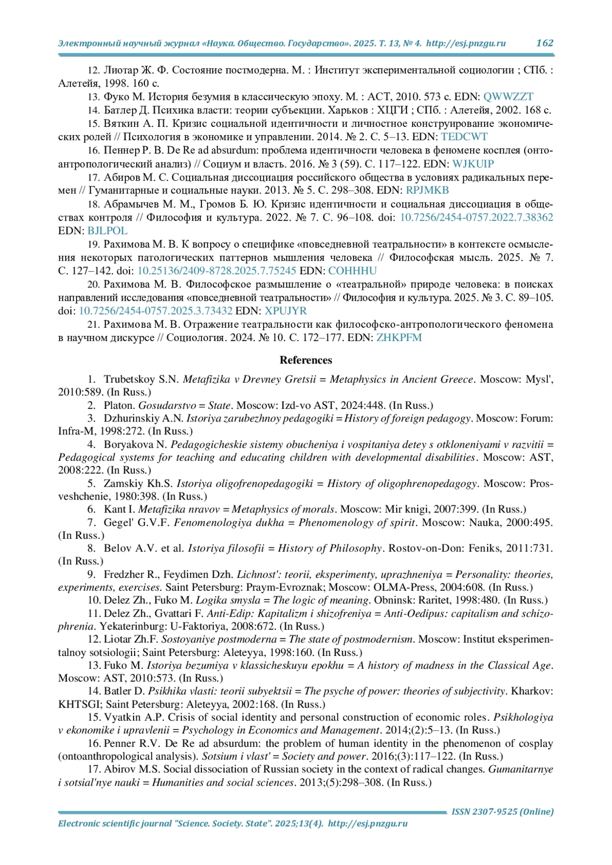 19. Рахимова М. В. К вопросу о специфике “повседневной театральности” в контексте осмысления некоторых патологических паттернов мышления человека // Философская мысль. 2025. № 7. С. 127-142. DOI: 10.25136/2409-8728.2025.7.75245 EDN: COHHHU